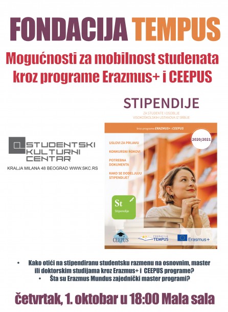 By Arhitektonski fakultet_Urednik on 28/09/2020četvrtak, 1. oktobar u 18:00 Mala sala SKC „Mogućnosti za mobilnost studenata kroz programe Erazmus+ i CEEPUS“ Fondacija Tempus -