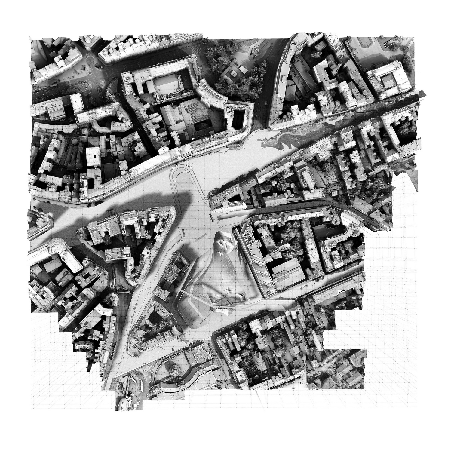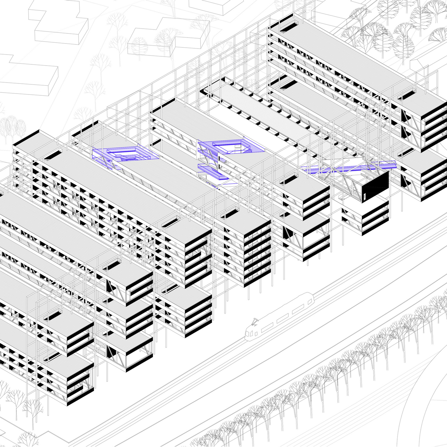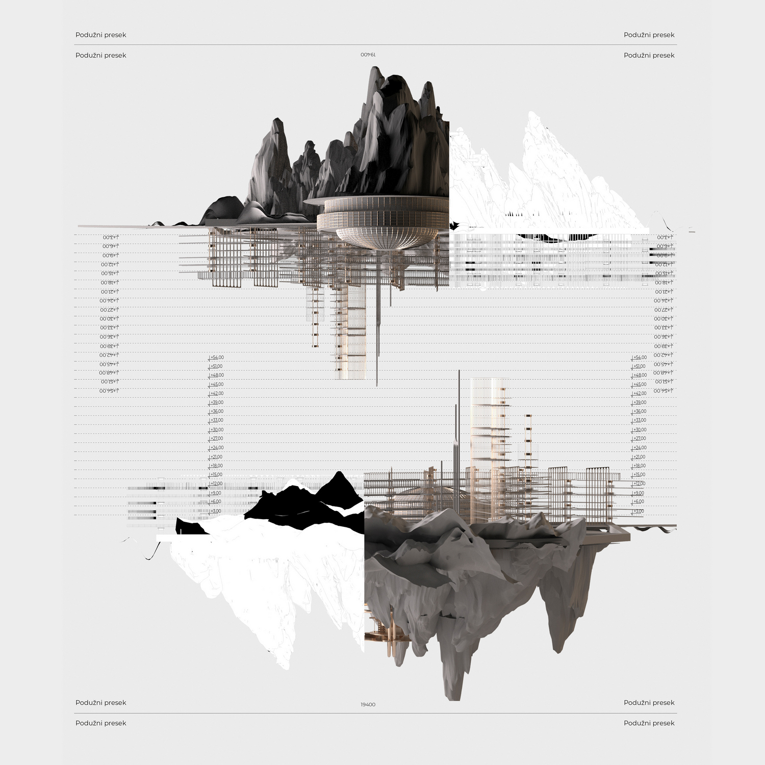 Predloženo rešenje predstavlja mesto na kome kontinualni niz „puca“ . Preispitavanjem konvencionalnog modela zgrade došlo se do „lebdećih štangli“ koje propuštaju svetlost i dozvoljavaju provetravanje stvarajući prijatne javne i polujavne prostore. Strukturu pored štangli čine i dve ramovske konstrukcije koje prihvataju opterećenje u dve tačkei time omogućuju utisak lebdenja. Struktura stanova je raznolika i zbog modularnosti ona može da bude promenjena ukoliko to tržište zahteva. Širok spektar stanova od jedinica za privremen boravak do dupleksa sa više spavaćih soba korespondira sa strukturom stanovništa kojima je ovaj kraj prijemčiv. Strukturu preseca dijagonalna rampa koja spaja partere dve ulice i iznad koje se javlja praznina koja se penje do vrha zgrade čime se ostvaruju nove vertikalne komunikacije i pristup dodatnom sadržaju –izložbenoj galeriji.
