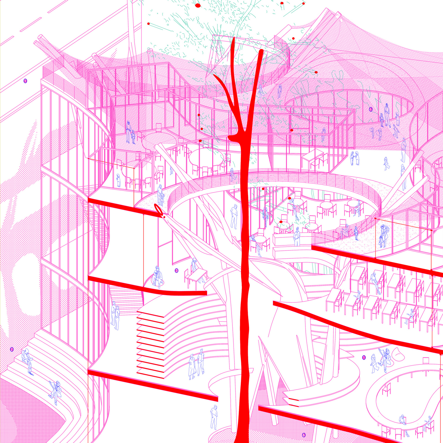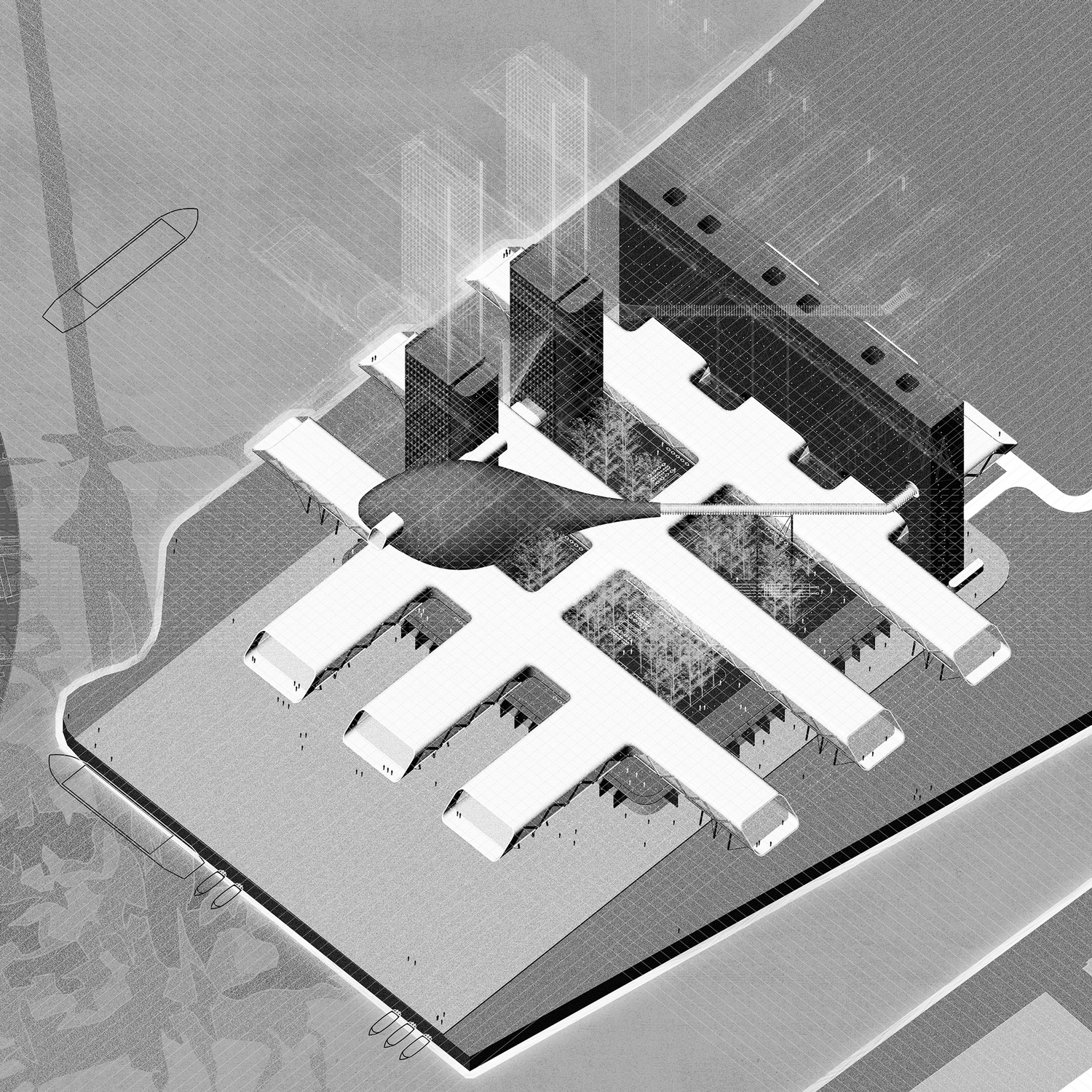 Koncept polazi od tri prepoznata problema u okviru analize problema: neatraktivnost, nepristupačnost i nedostatak funkcija koje oplemenjuju prostor. Kao odgovor na problem, nastaje ideja o kombinaciji različitih funkcija unutar bloka, što bi značilo i prisustvo više tipova korisnika i aktivnosti. Kompleks je osmišljen kao multifunckionalni prostor sa laboratorijom za istraživanja, radnim prostorom za iznajmljivanje, čitaonicom i bibliotekom, auditorijumom i salama za sastanke, kao i kampusom sa sobama, restoranom i zonom za odmor.