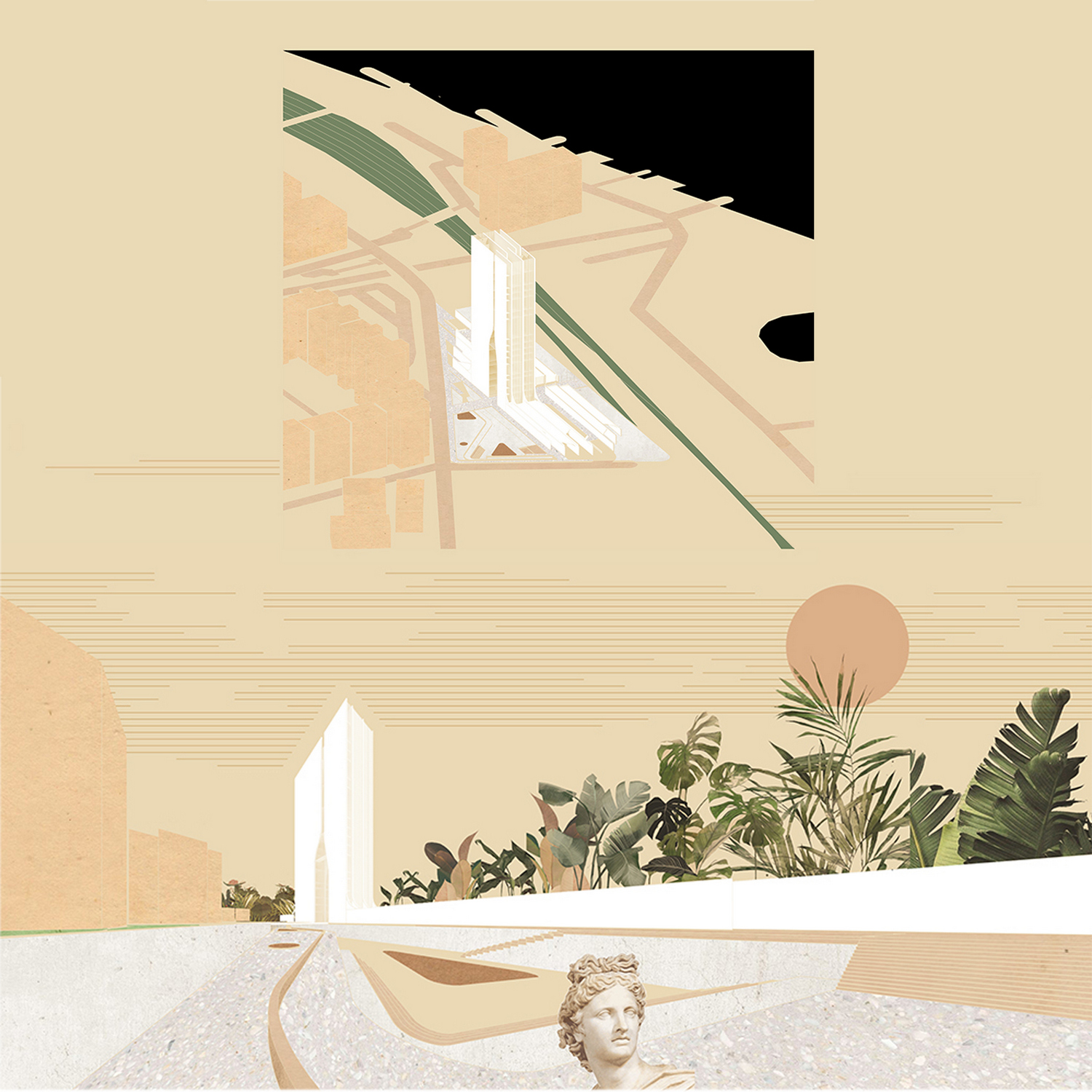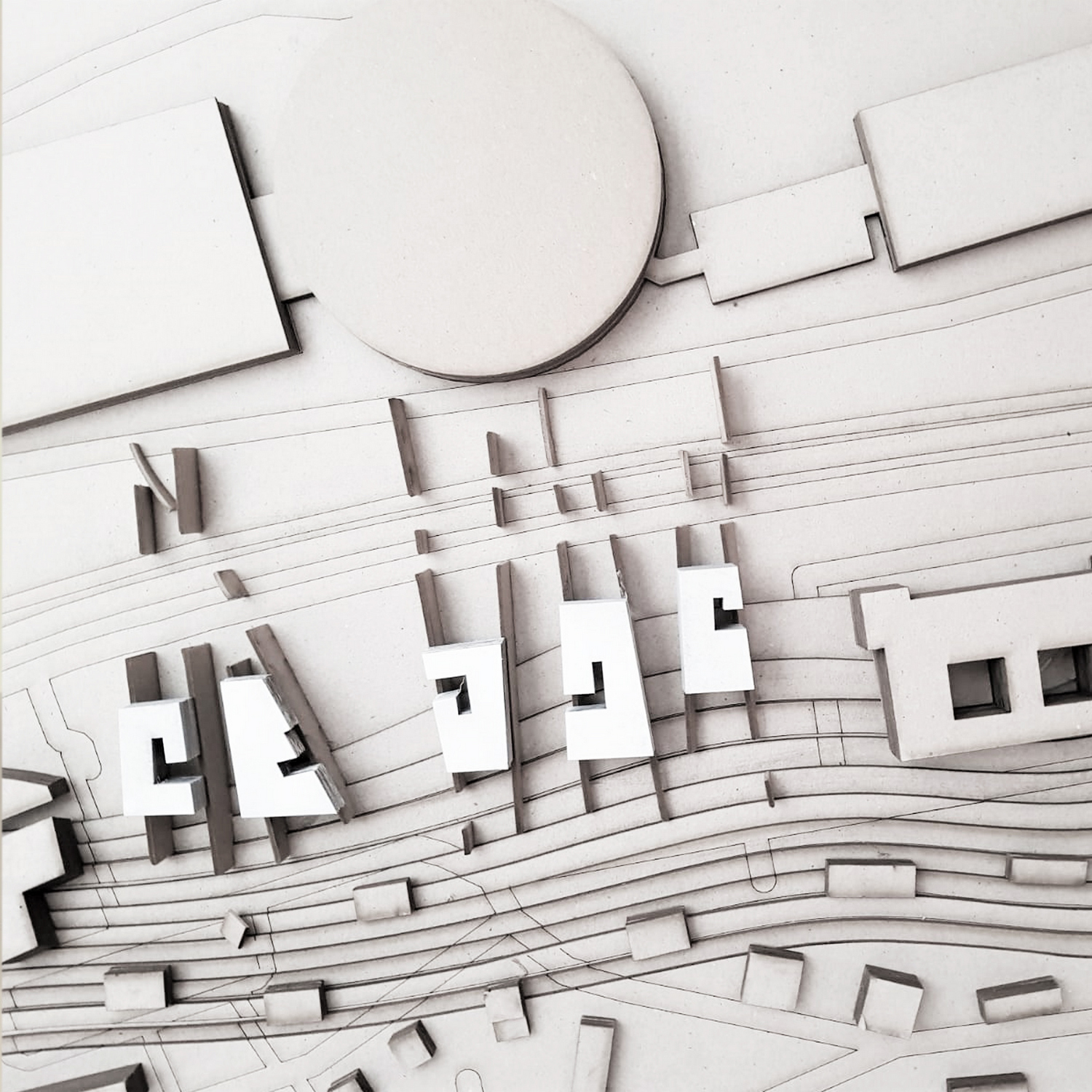 Početak projektovanja jeste istraživanje lokacije i okruženja, na osnovu čega fokus razrade u ovom slučaju pada na korišćenje pokrenutog terena za formiranje vizura ka reci i Novom Beogradu. Prostor je u prizemlju u potpunosti oslobođen kako ne bi došlo do podele između javnog i polujavnog prostora, dok s druge strane veliki objekti predstavljaju jasnu granicu između rezidencijalnog i spoljašnjeg. Izdizanjem objekata na betonske šajbne postiže se efekat usmeravanja kako pogleda tako i kretanja korisnika. Pešačke staze koje prodiru kroz ove šajbne formiraju zanimljiv doživljaj pri kretanju jer su procepi koji dele velike otvorene površine između njih veoma uski.