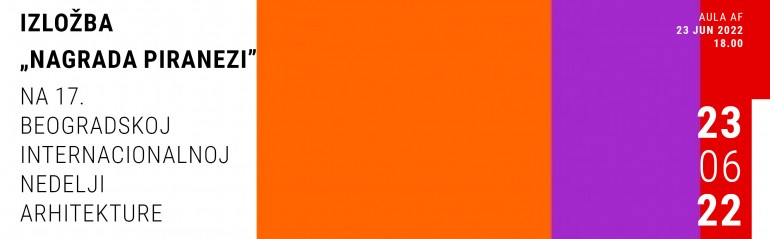 Pozivamo sve studente, nastavnike i saradnike fakulteta, i širu stručnu javnost na otvaranje Izložbe „Nagrada Piranezi” u okviru 17. Beogradske internacionalne nedelje arhitekture koja će se održati u auli Univerziteta u Beogradu – Arhitektonskog fakulteta.