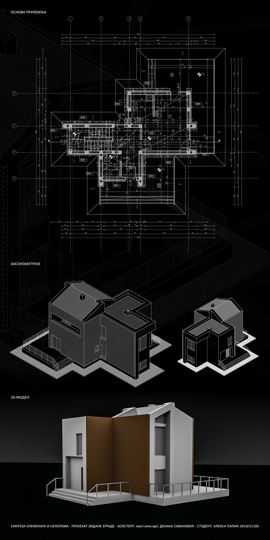 Projekat porodične, vikend kuće. Kuća sadrži tri etaže, podrum, prizemlje i sprat. U podrumu se nalaze kotlarnica i ostava, u prizemlju se nalazi hodnik, dnevna soba sa trpezarijom i kuhinjom i kupatilo. Na spratu se su hodnik i dve spavaće sobe. Dve terase se nalaze u prizemlju, a na terasu na spratu izlaz ima velika spavaća soba, ta terasa je uvučena u objekat. Takođe kuća sadrži i ravan i kos krov.