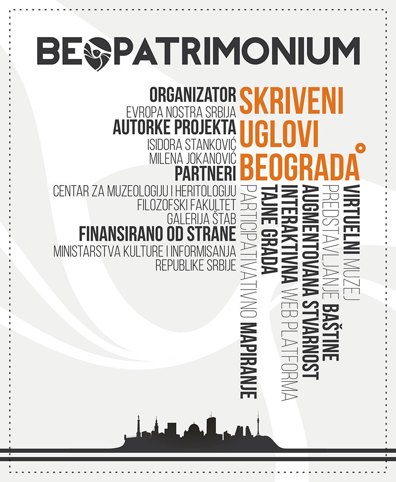 Zadovoljstvo nam je da vas pozovemo na radionicu “Skriveni uglovi Beograda – Participativno mapiranje nasleđa grada”, koju Evropa Nostra Srbija organizuje u saradnji sa Centrom za muzeologiju i heritologiju Filozofskog fakulteta u Beogradu. Radionica, koja će biti održana od 11. do 13. decembra 2015. godine, predstavlja deo projekta BeoPatrimonium, koji kreiranjem “virtuelnog muzeja” grada Beograda ima za cilj da predstavi različite poglede na nasleđe ovog grada, kako posetilaca portala, tako i istraživača na projektu i studenata Filozofskog fakulteta u Beogradu.