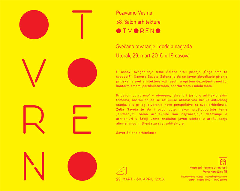 „Otvoreno“ je tema 38. Salona arhitekture koji će se održati u svom tradicionalnom prolećnom terminu od 29. marta do 30. aprila 2016. u Muzeju primenjene umetnosti. Kao i svake godine, na ovom prvorazrednom arhitektonskom događaju, okupiće se u galerijama Muzeja, brojne arhitekte iz zemlje i inostranstva.