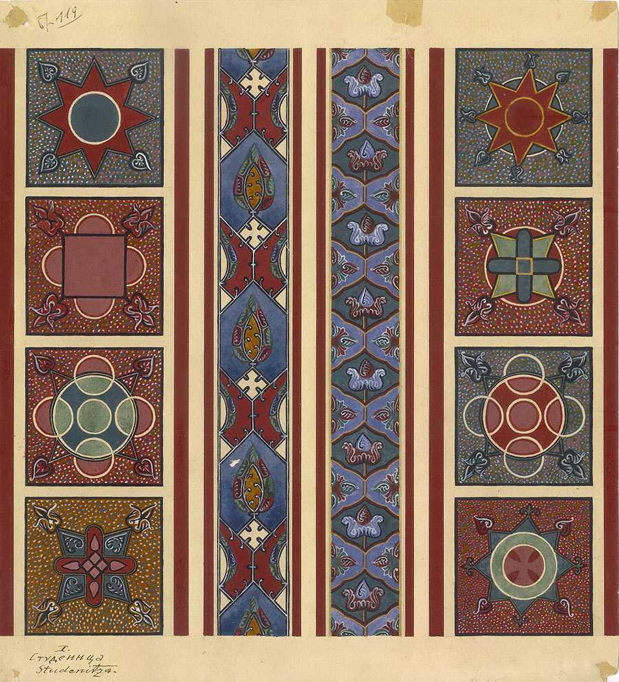 Драгутин Милутиновић, Краљева црква у Студеници, детаљи фреско-декорације, 1880. Акварел. Извор: Слика је у власништву © Историјског музеја Србије. Инв. бр. 3689