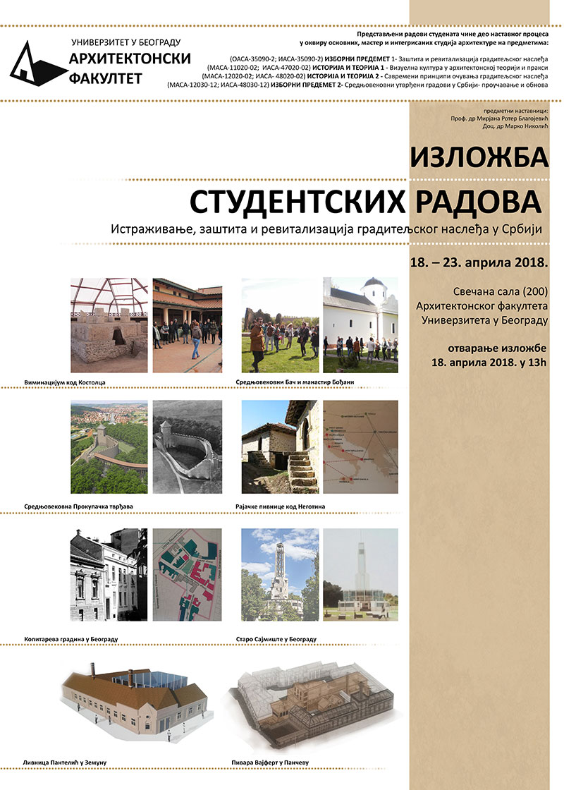Pozivamo Vas na izložbu radova studenata Osnovnih, Master i Integrisanih akademskih studija Arhitektura šk. 2016/2017. i 2017/2018. godine iz oblasti “Istraživanje, zaštita i revitalizacija graditeljskog nasleđa u Srbiji”.
