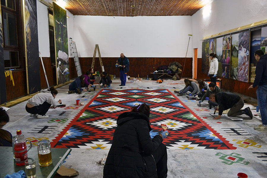- Izrada velikog Pirotskog ćilima na podu sale. Time se sala simbolički pretvara u “seosku dnevnu sobu”, ali i skreće pažnja na pirotski ćilim kao jedno od 27 nematerijalnih kulturnih dobara Srbije na UNESKO-voj listi. U skladu sa razumevanjem da identitet mesta ne čine samo materijalni atrefakti, već i različiti slojevi duhovne prirode, simbolička tumačenja i značenja, cilj je ukazivanje na značaj i ranjivost nematerijalnog kulturnog bogatstva koje se lako gubi ukoliko izgubimo svest o njegovom postojanju, načinu i uslovima njegovog nastajanja.
