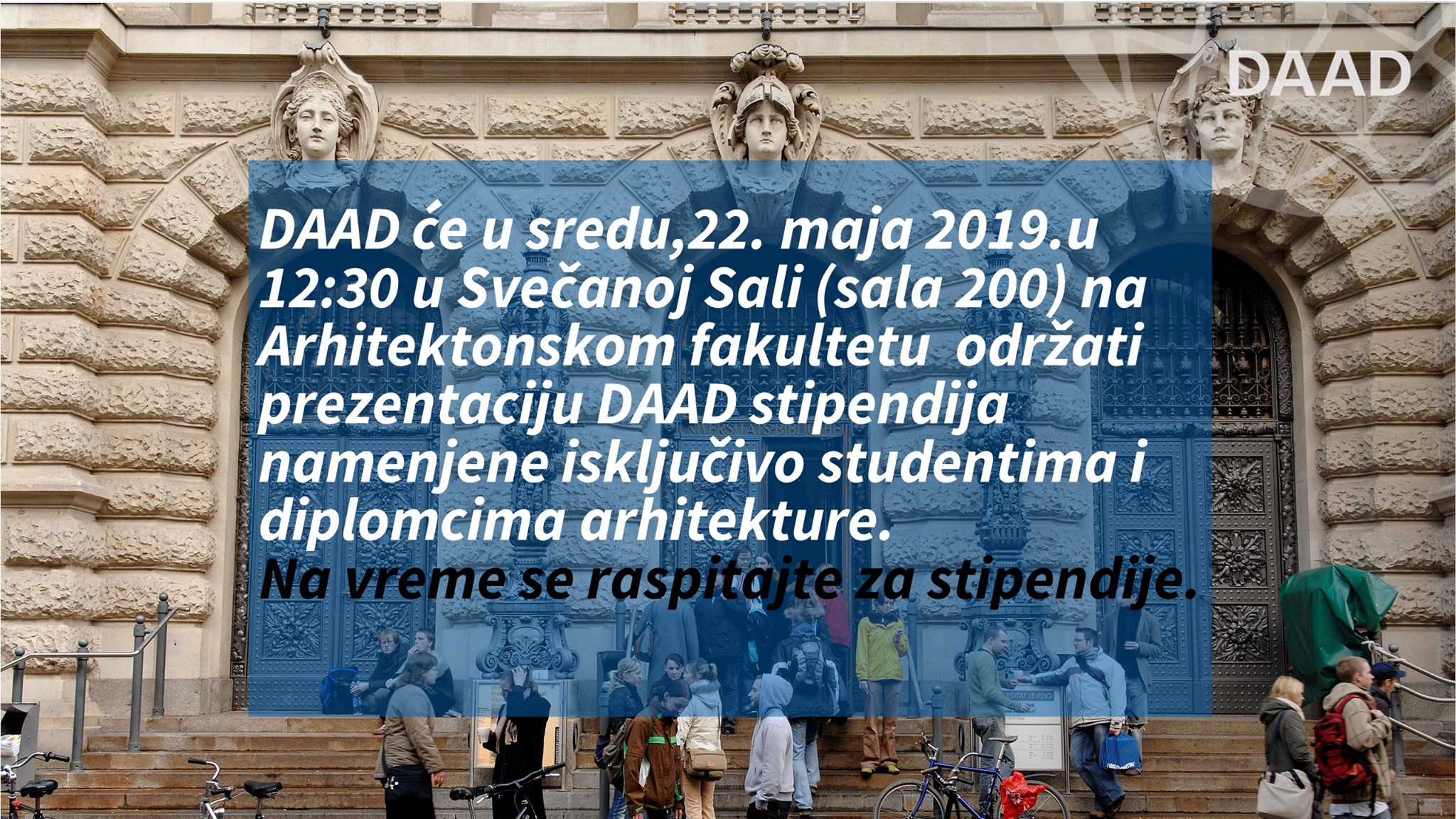 Nemačka služba za akademsku razmenu – Deutsche Akademische Austausch Dienst (DAAD) će održati prezentaciju svojih stipendijskih programa za boravke na univerzitetima u Nemačkoj, u sredu 22. maja 2019. godine u 12.30 časova, u svečanoj sali (200) Arhitekstonskog fakulteta.
