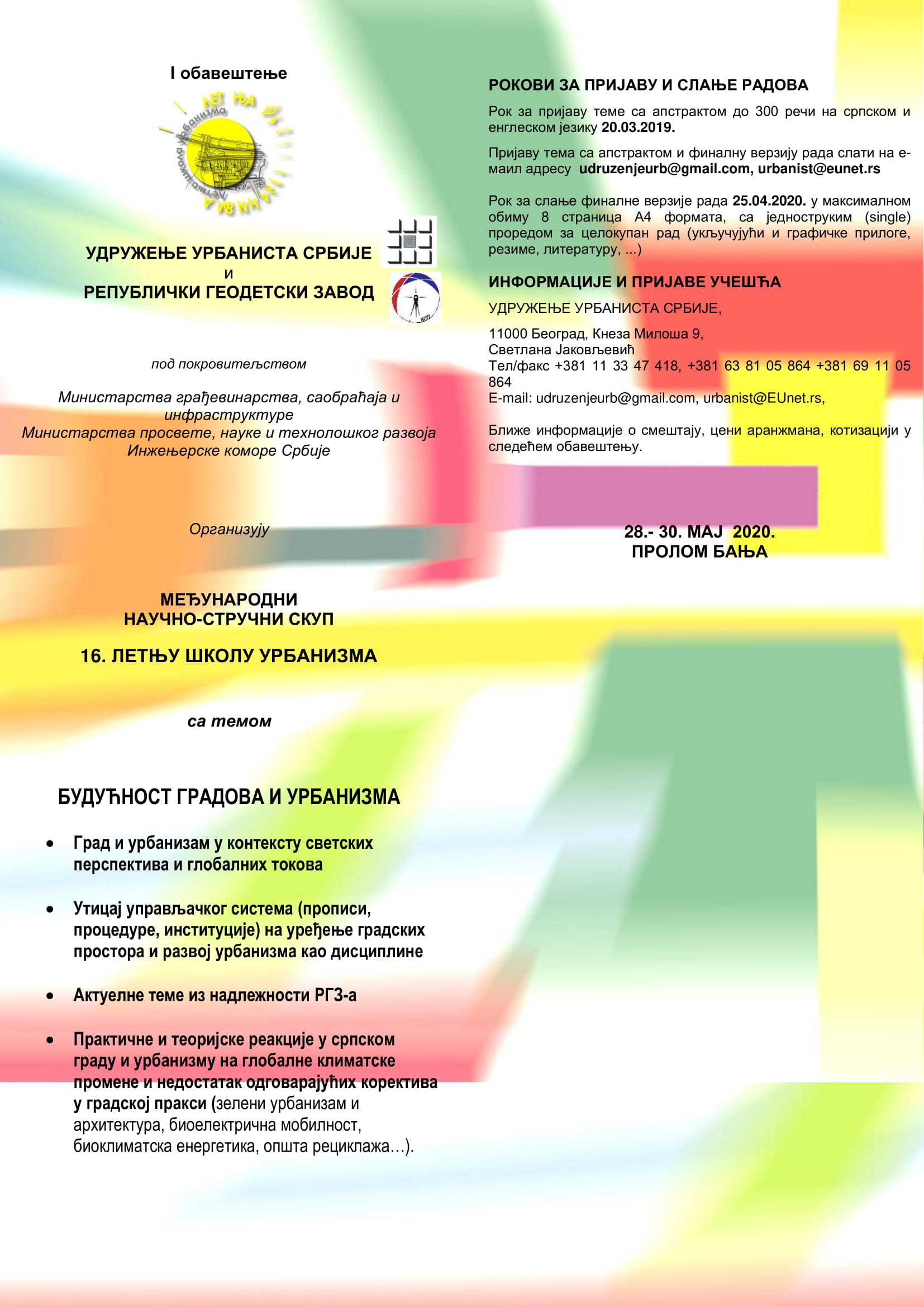UDRUŽENJE URBANISTA SRBIJE i REPUBLIČKI GEODETSKI ZAVOD pod pokroviteljstvom Ministarstva građevinarstva, saobraćaja i infrastrukture Ministarstva prosvete, nauke i tehnološkog razvoja Inženjerske komore Srbije Organizuju MEĐUNARODNI NAUČNO-STRUČNI SKUP 16. LETNJU ŠKOLU URBANIZMA sa temom BUDUĆNOST GRADOVA I URBANIZMA