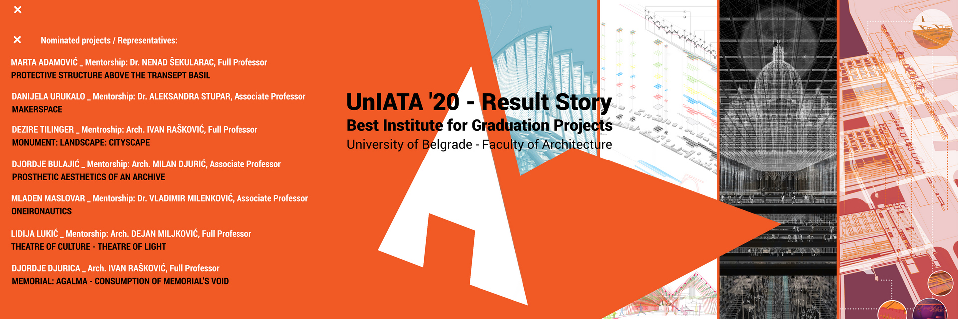 Univerzitetu u Beogradu – Arhitektonskom fakultetu dodeljena je nagrada za najbolju instituciju diplomskih projekata (Best Institute for Graduation Projects Award) u okviru UnIATA ’20 godišnjeg konkursa.