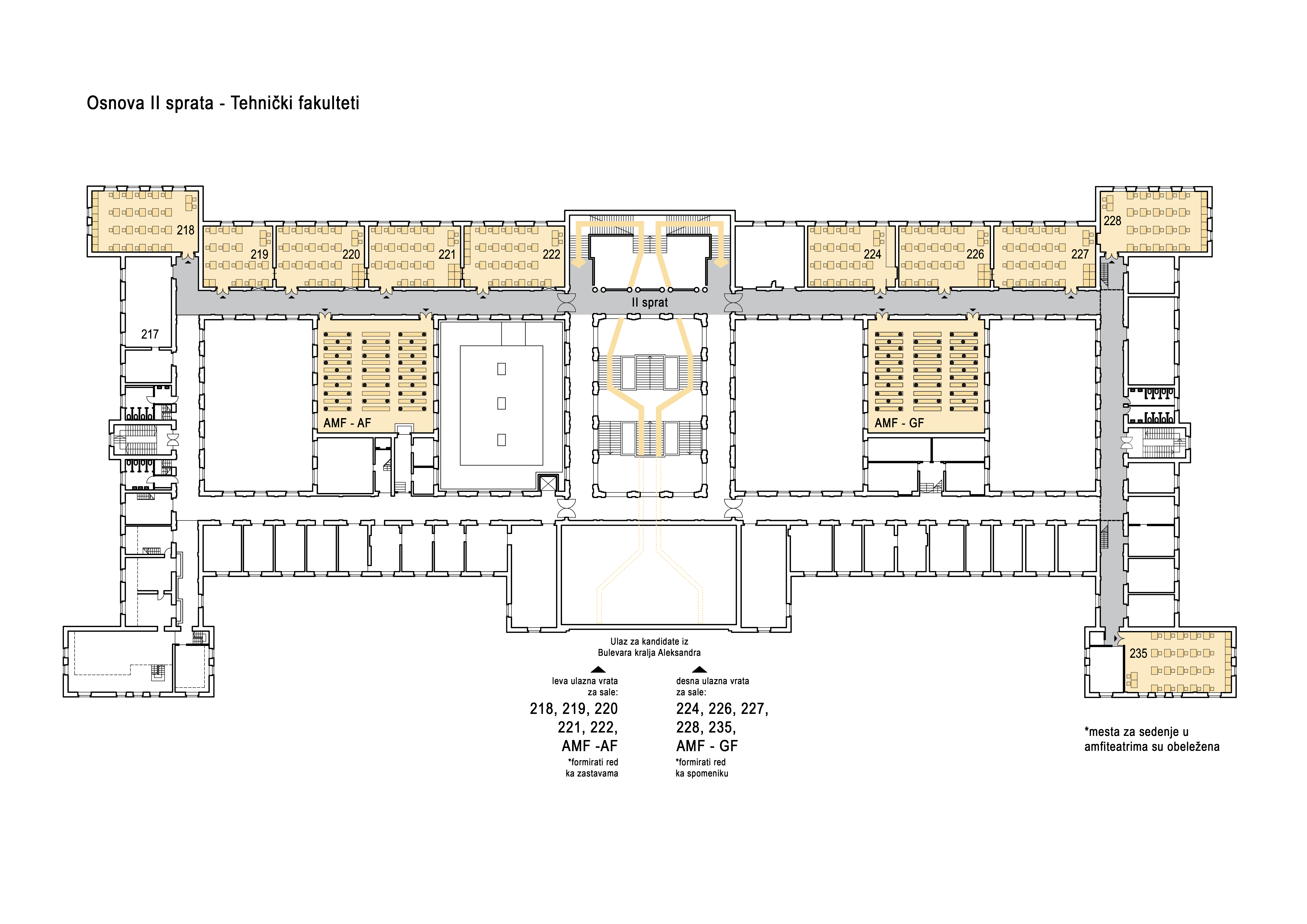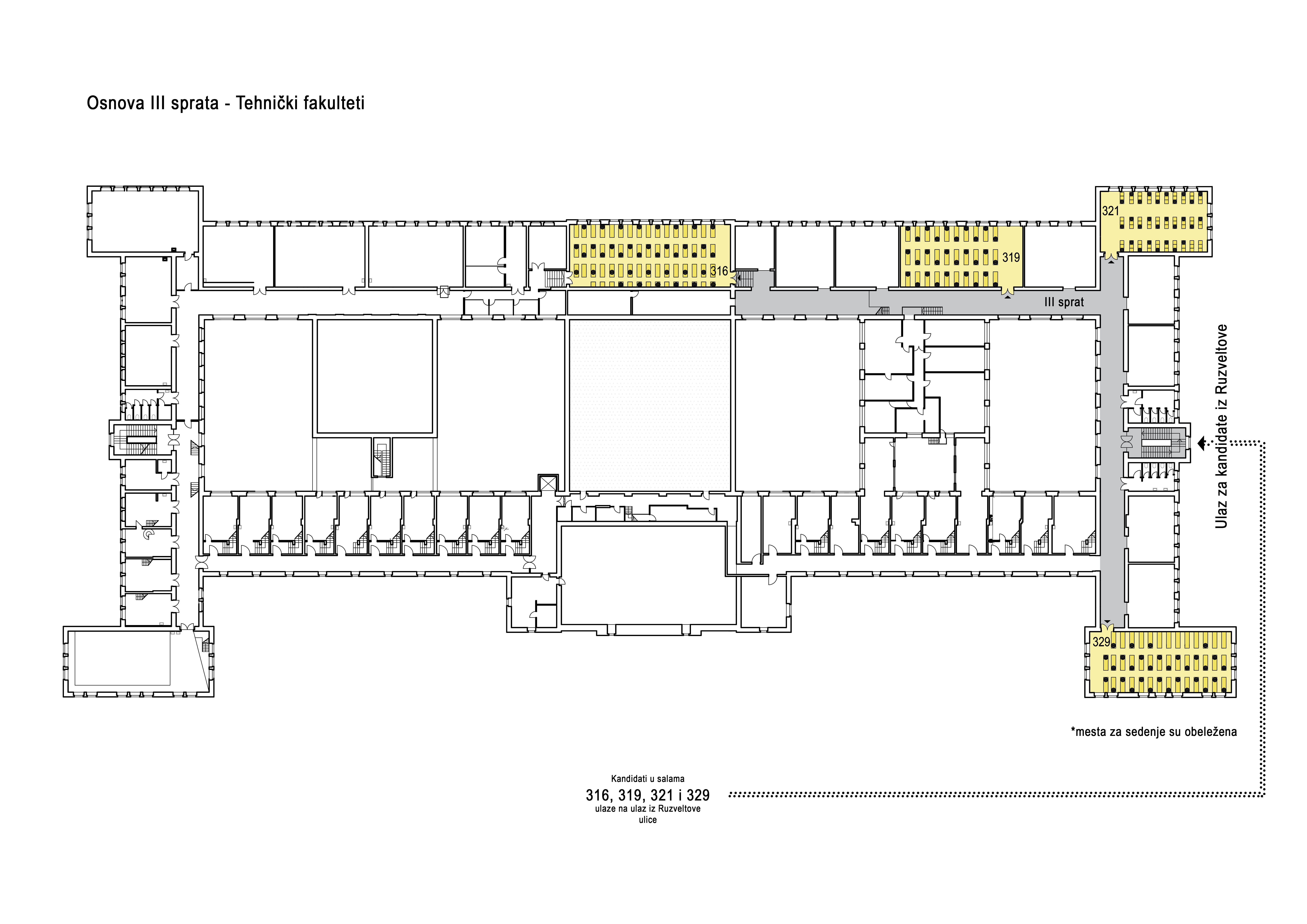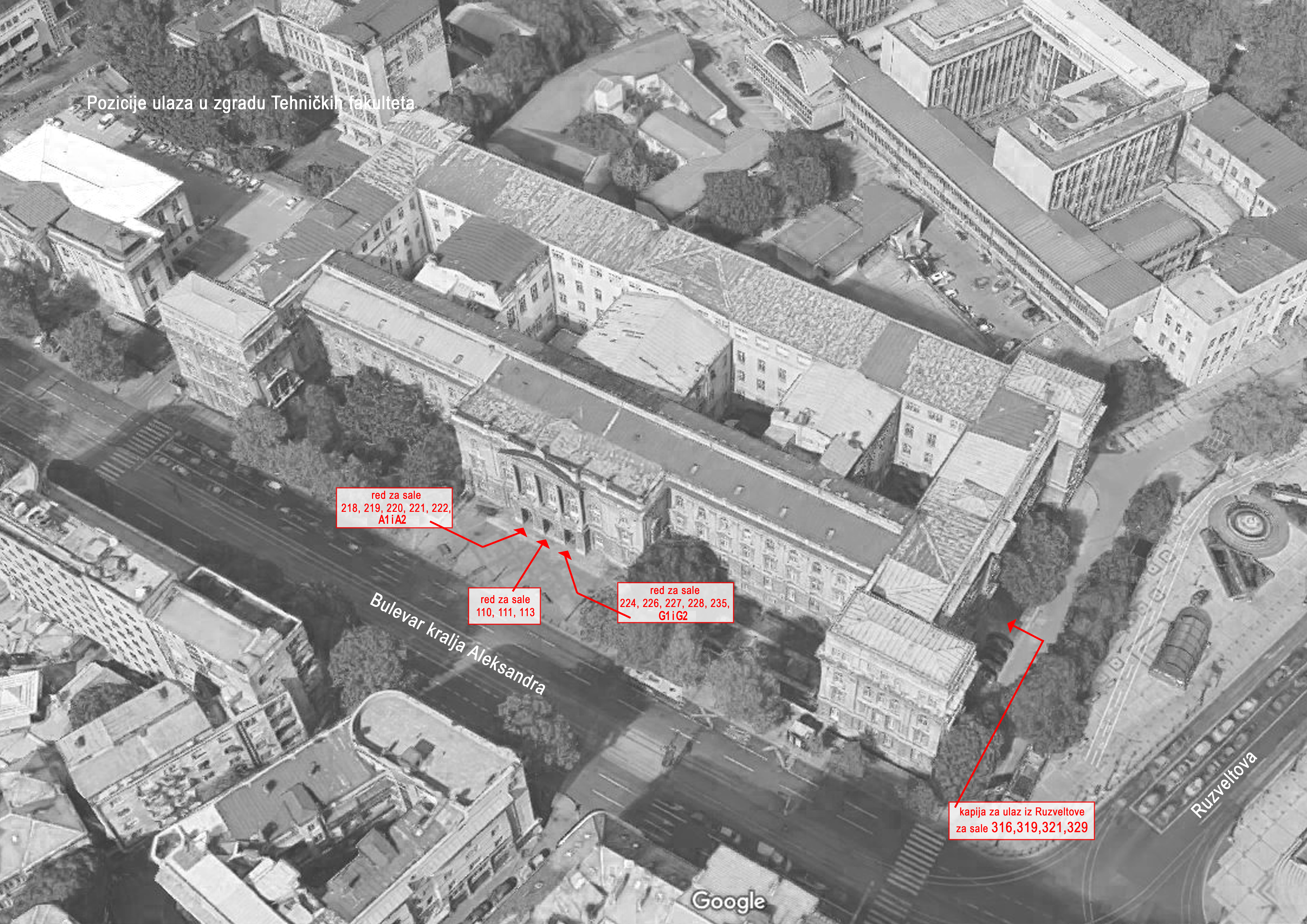 Ulazak u zgradu tehničkih fakulteta će biti organizovan iz Bulevara kralja Aleksandra, kao i iz Ruzveltove ulice, na bočnom ulazu, sa parkinga. Kandidati su podeljeni u grupe, prema salama u kojima polažu prijemni ispit i shodno tome, ispred odgovarajućeg ulaza. Raspored grupa za ulazak po salama je prikazan u prilogu ove objave.
