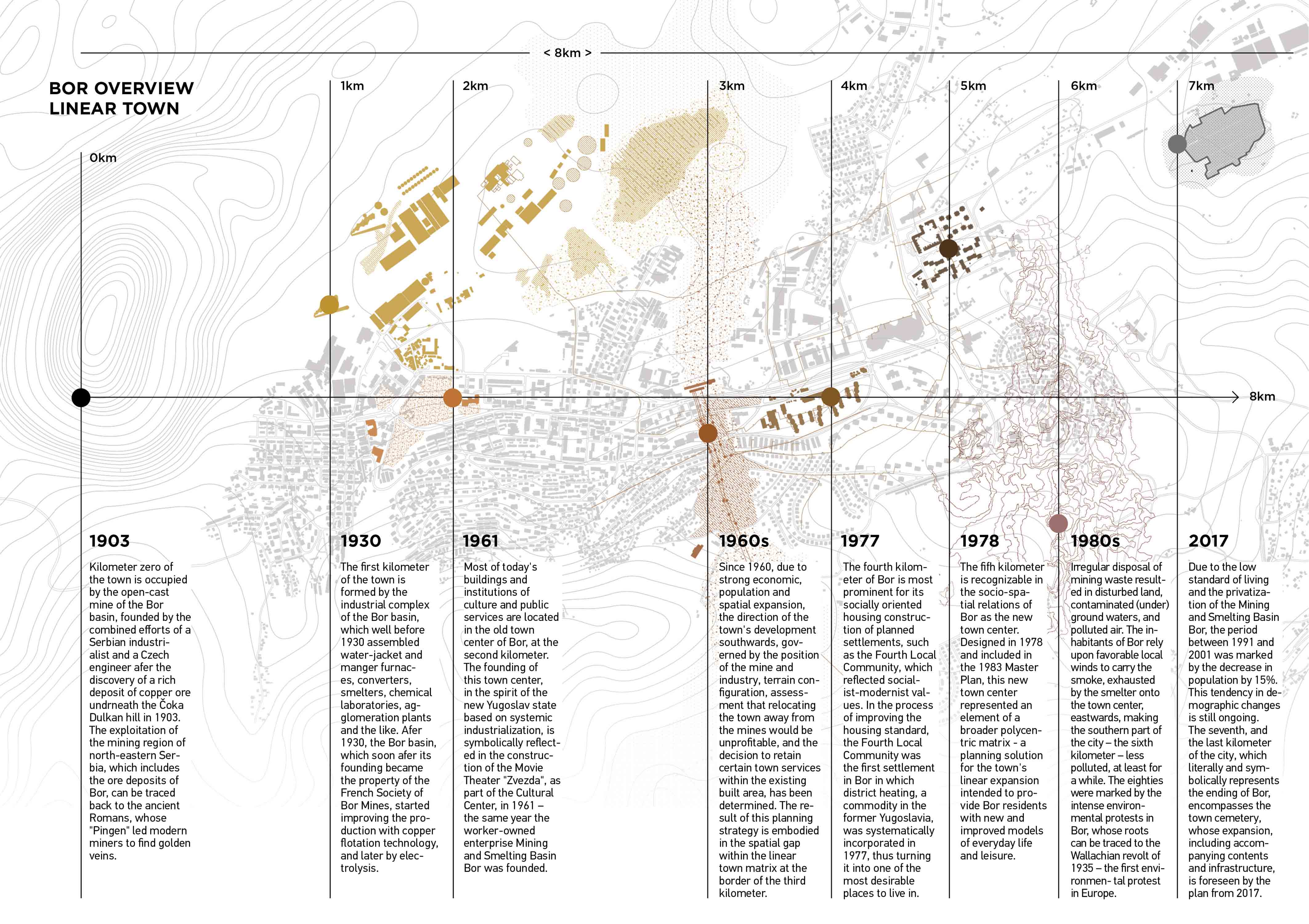 Izložba prikazuje kako se na primeru Borskog basena razvijena rudarska proizvodnja do sada jednoznačno postavljala kao isključivi faktor postojanja grada. Umrežavanjem ove proizvodnje u globalne tokove kapitala, u gradu se ispoljava odsustvo mogućnosti rada na društvenom i prostornom planu. Ujedno, usled neodrživosti predloženih alternativa socio-ekonomskog razvoja Bora, to je i prilika za redefinisanje odnosa život – rad, a time i fizičkog okvira unutar kog se navedeni procesi odvijaju. Stoga izložba i istraživanje razmatraju budućnost ovog odnosa kroz temu „osmog kilometra”, koji uvodi poremećaj u poredak postojećih sedam gradskih zona – sedam gradskih kilometara. Svaki od sedam kilometara istražen je ujedno kroz studije arhivske građe i kroz projekat teme koja je specifična za određeno područje, to jest, kilometar grada. Odgovarajuće teme su redom: industrija, prostorno planiranje, prostori kulture, stambeni standard, kultura svakodnevnog života, ekologija, i demografija.