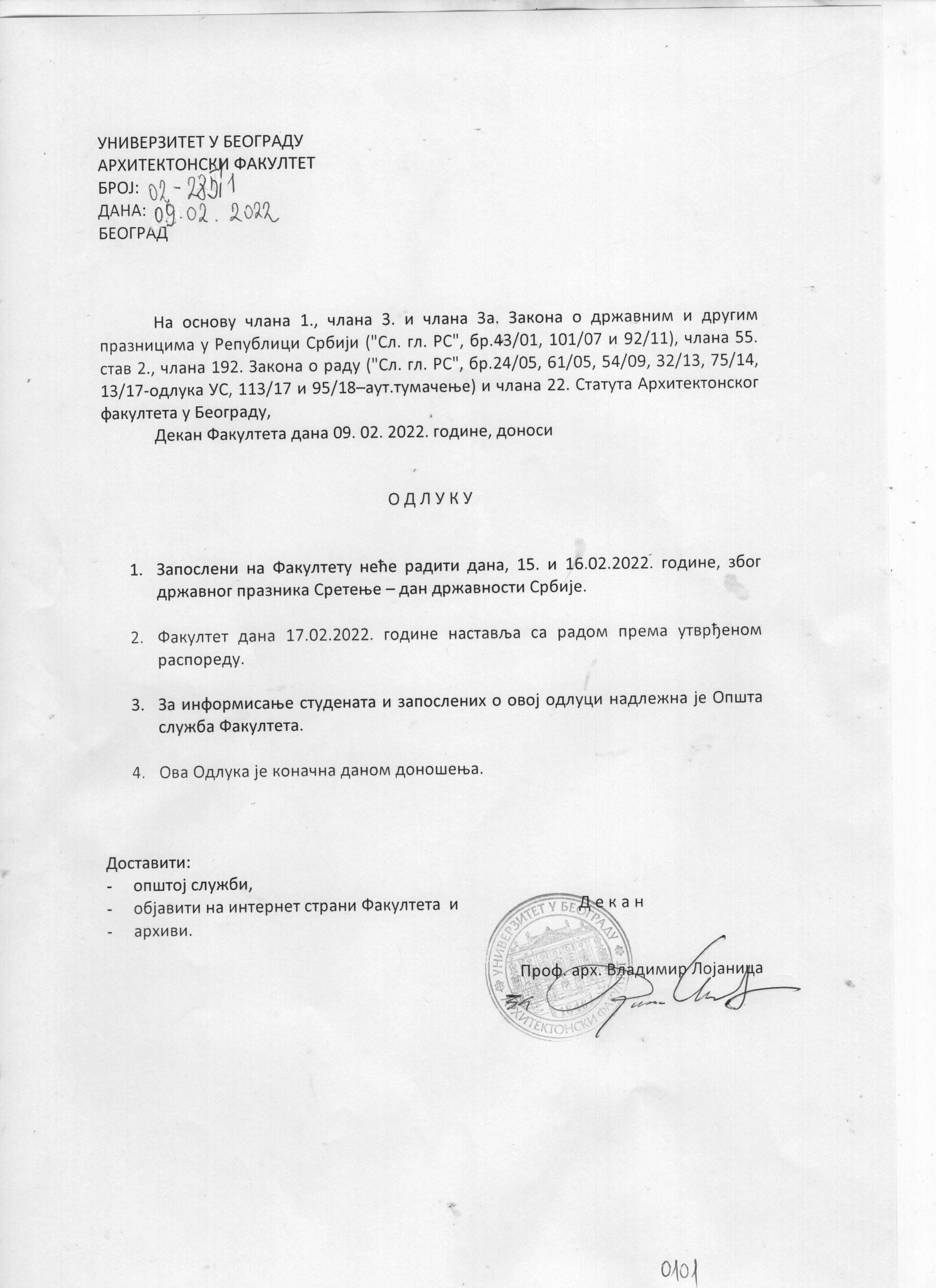 Запослени на Факултету неће радити дана 15.02.2022. и 16.02.2022. године због државног празника Сретење – Дана државности Србије. Одлука Аутор:Архитектонски факултет On 09/02/2022 ВестиОдабрано 0 Шири даље: Permanent Link Пошаљи емаилом Сродни текстови Свечана додела диплома на прослави Дана студената 4. априла 2016. Изложба “ВИШЕСЛОЈНОСТ” и ЖАД Трибина: Слојеви наслеђа Београда Предавања и панел дискусија: Савремена архитектура Португала Упис у прву годину Докторских академских студија – Архитектура и урбанизам 2018/19 ПРОТОКОЛ СПРОВОЂЕЊА НАСТАВЕ У ПРОЛЕЋНОМ СЕМЕСТРУ – Школска 2021-2022.година ЈАВНИ ПОЗИВ ЗА ВОЛОНТЕРЕ – 44. Салон архитектуре