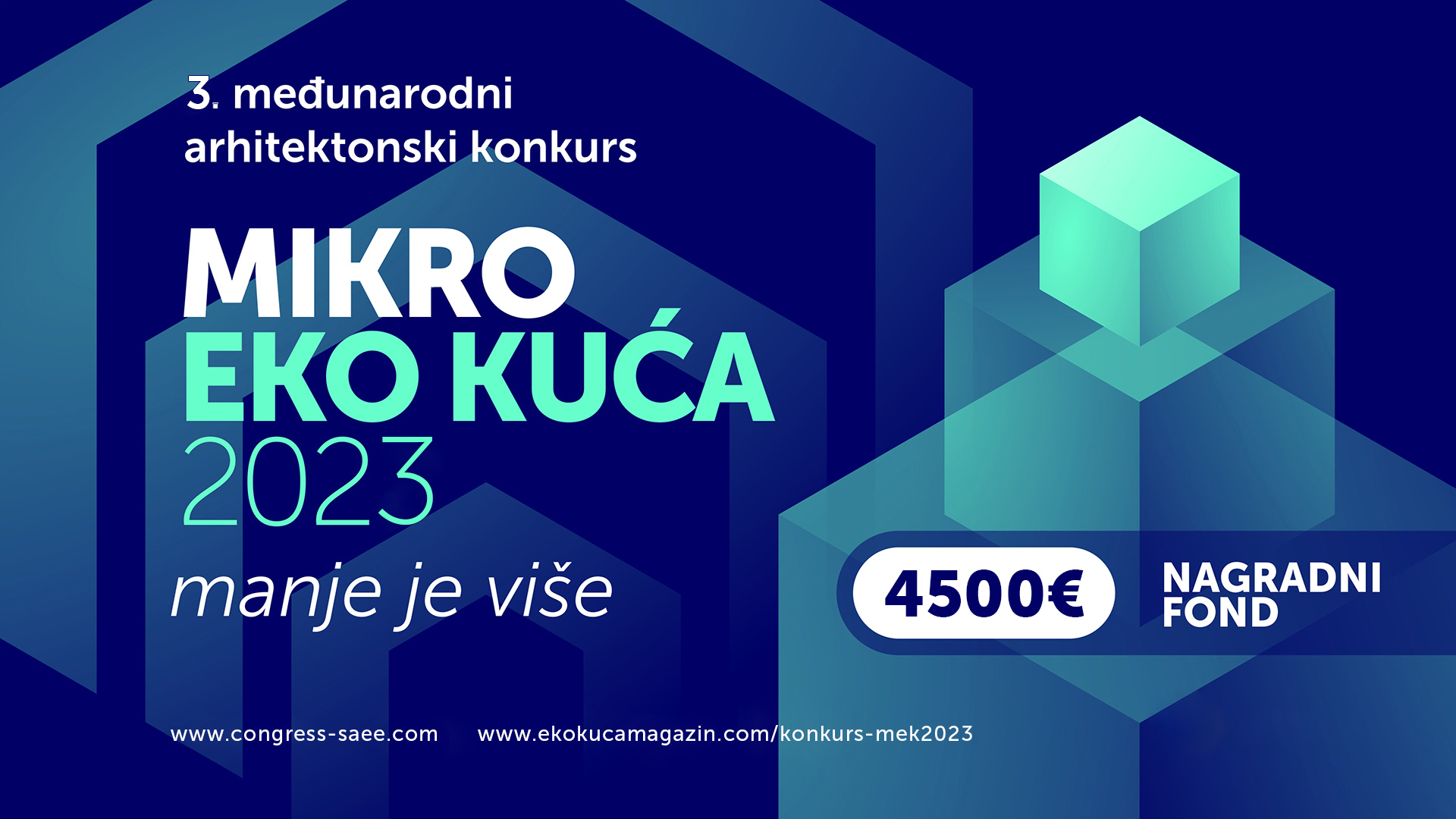 Удружење Ekokultplus из Београда, Архитектонски факултет Универзитета у Београду и Магазин за еко архитектуру и културу ЕКО КУЋА расписују Трећи међународни архитектонски конкурс за идејно архитектонско решење на тему МИКРО ЕКО КУЋА 2023. Конкурс је намењен младим архитектима, дизајнерима, пејзажним архитектима и примењеним уметницима старости до 30 година и студентима факултета из наведених области. Рок за предају радова је 1. септембар, а наградни фонд износи 4.500 евра.