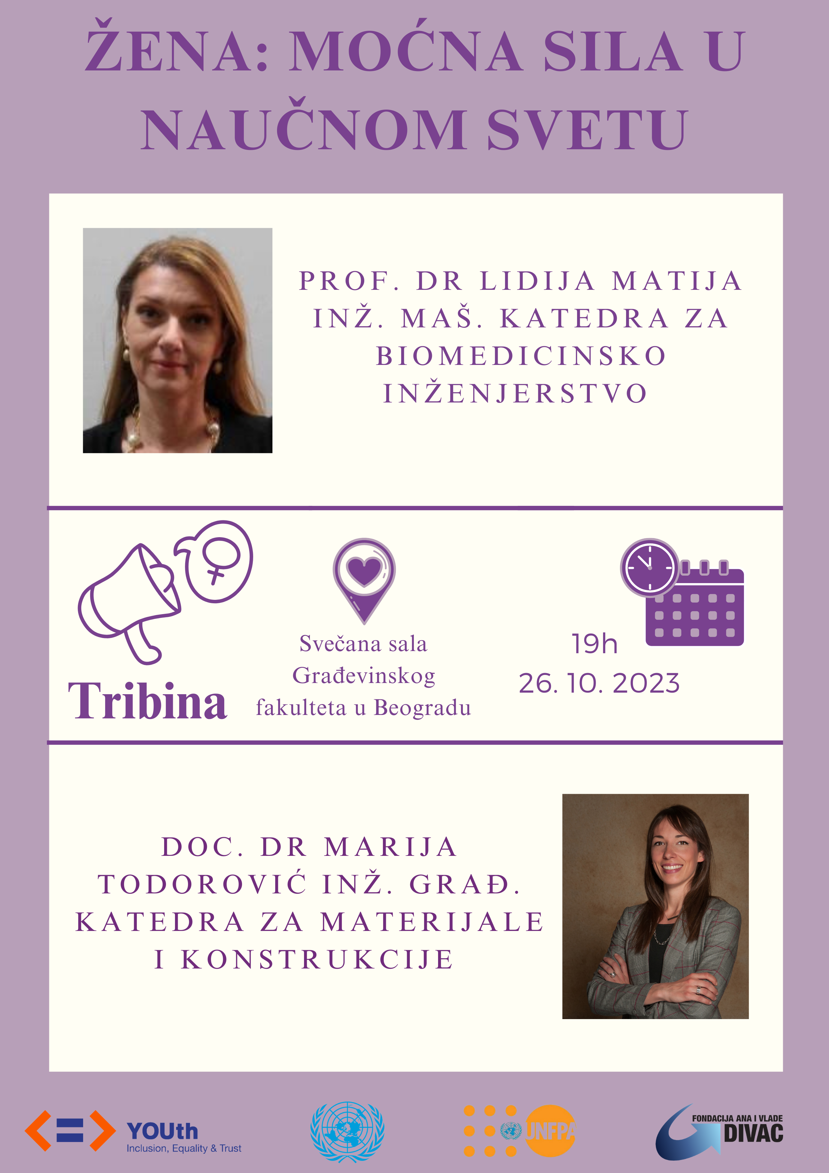 Publika će imati priliku da sluša eksperte iz polja tehničkih nauka, prof. dr Lidiju Matiju, inženjerku mašinstva sa katedre biomedicinskih nauka i doc. dr Mariju Todorović, inženjerku građevinarstva sa katedre za materijale i konstrukcije.