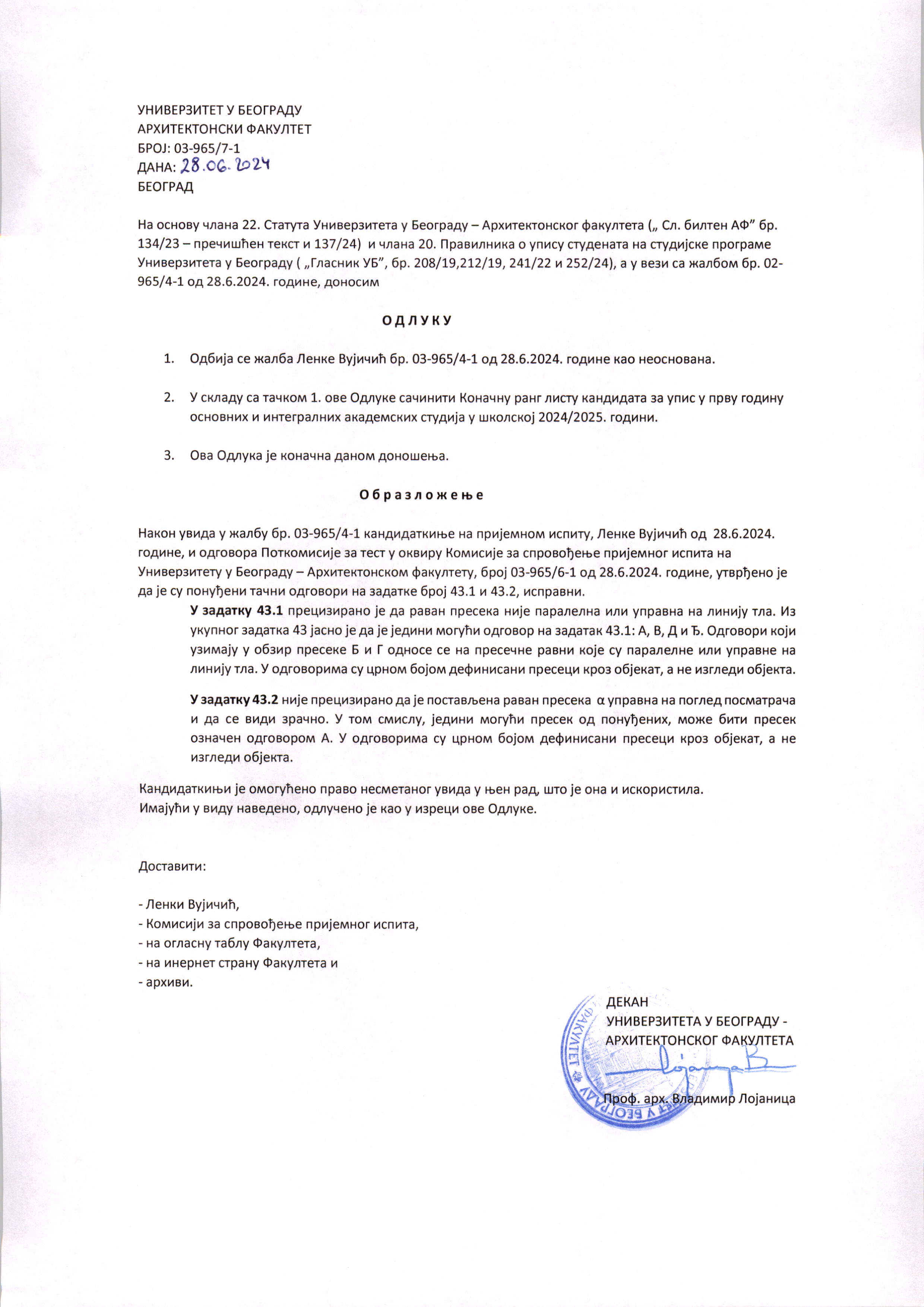 Konačna Odluka Dekana na podnete žalbe u drugostepenom postupku žalbi nalazi se na sledećem linku: ODLUKA Autor:Arhitektonski fakultet On 29/06/2024 VestiOdabranoOsnovne i Integrisane studije 2024Prijemni ispit 2024UpisUpis 2024/25 12 Širi dalje: Permanent Link Pošalji emailom Srodni tekstovi Međunarodna naučna konferencija – Arhitektonske ustanove i udruženja, umetničke grupe i udruženja u Kraljevini SHS/Jugoslaviji (1918-1941) Arhitektonski fakultet u Beogradu među 100 najboljih škola arhitekture i dizajna u Evropi Konkurs Zadužbine Đoke Vlajkovića za podršku studentima u stručnom i naučnom usavršavanju tokom 2019/20 PRIJEMNI I UPIS 2025: Septembarski upisni rok – Uputstvo za upis kandidata Prijemni i Upis 2024: Konačne rang liste Prijemni i Upis 2024: Rešenje komisije za sprovođenje upisa na podnete žalbe kandidata