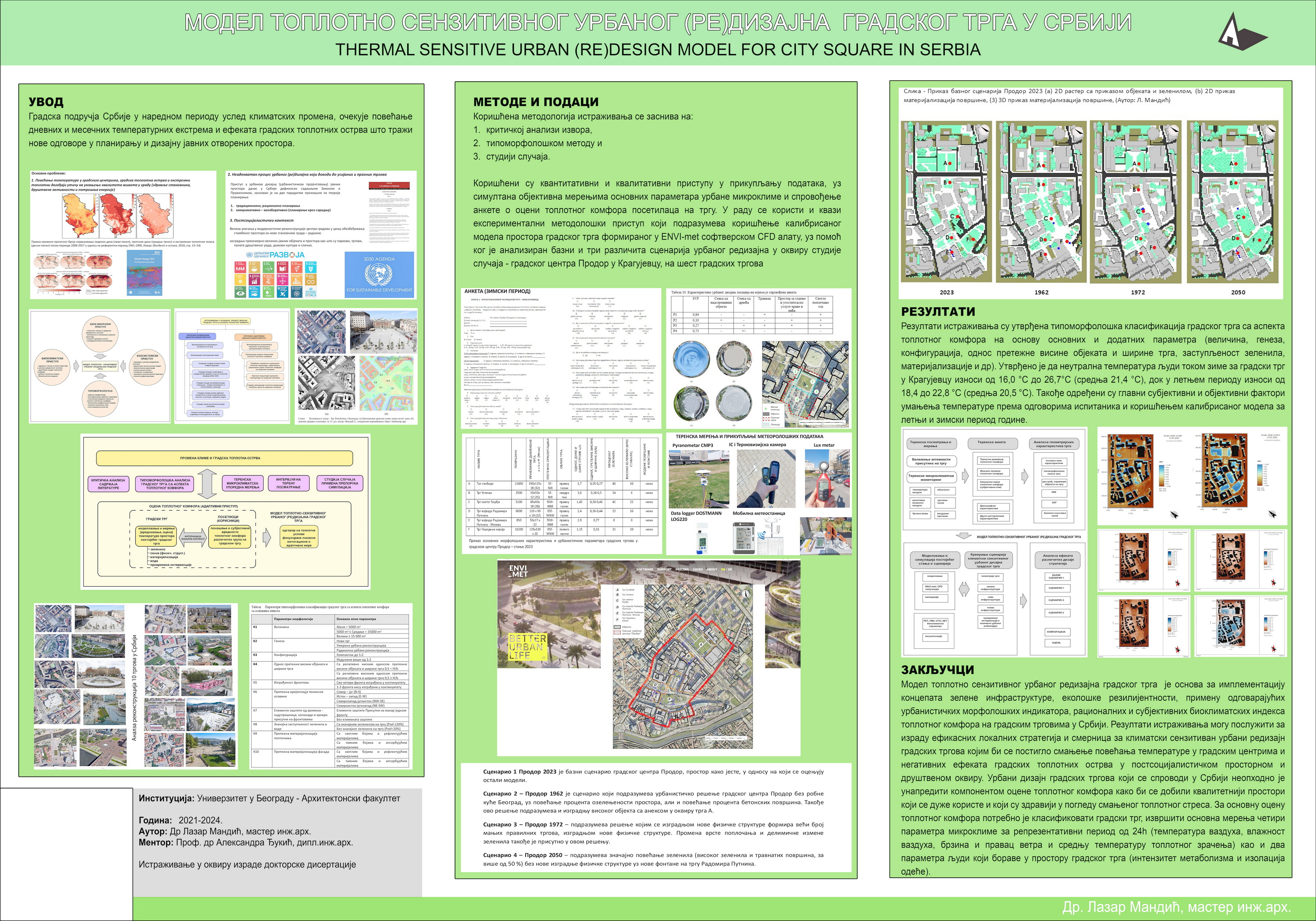 - MODEL TOPLOTNO SENZITIVNOG URBANOG (RE)DIZAJNA GRADSKOG TRGA U SRBIJI, Autor: dr Lazar Mandić, Mentor: Prof. dr Aleksandra Đukić, Univerzitet u Beogradu – Arhitektonski fakultet