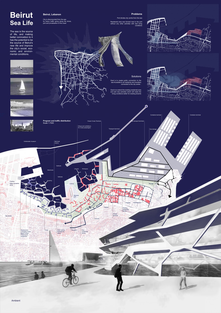 Bivša luka  i autoput koji se proteže duž čitave obale Bejruta ograničava pristup centra i ostatka grada na more. U blizini luke je uočeno neformalno stambeno naselje koje je slabo povezano sa ostatkom grada i ne poseduje prateće stambene sadržaje. Odgovor na ove probleme je sa jedne strane širenje oblasti centra grada sa rekreativnim sadržajima koji podrazumevaju vodene sportove i plažu. Na ovaj način se vrši približavanje mora gradu, a izlazak gradske strukture na more se vrši uvođenjem stanovanja sa pretećim sadržajima koji bi omogućili neophodnu gustinu da bi prostor živeo 24 sata. Uvedene su nove trase koje neformalno naselje spajaju sa planiranim i centrom grada, a modelovanjem terena je ublažena fizička odvojenost priobalne zone. Luka je izmeštena i fizički je zagađena lučna voda odvojena od vode predviđene za vodene sportove.