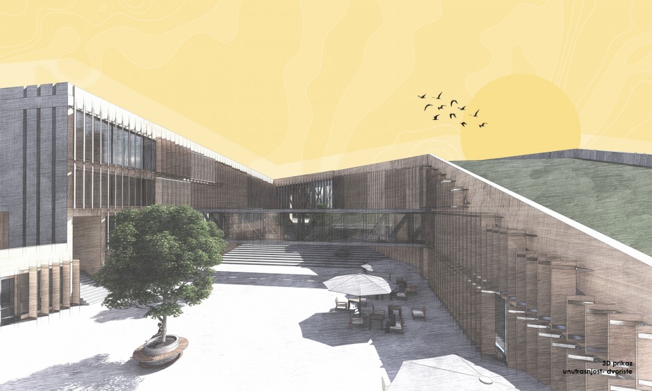 Dinamičnosti objekta doprisnosi dugi zeleni krov koji se uzdiže i spušta i naglašena kosa fasadna ravan višespratne zgrade administracije. Naizgled puna fasada ka okolini od betonskih elemenata i uskih procepa sa tek ponekim prozorom i staklena fasada ka dvorištu sa pokretnim brisolerjima doprinose autentičnom karakteru objekta poistovećenom sa debelim koricama knjige i taknim, prozirnim listova.