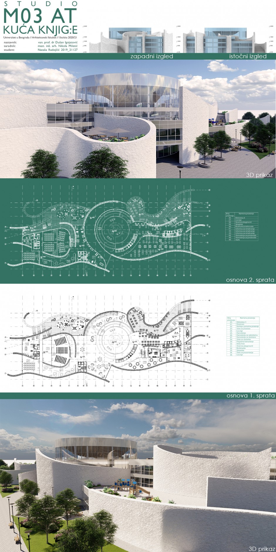 Analizom lokacije, bloka 39, na Novom Beogradu prepoznat je atraktivan položaj jednog multifunkcionalnog objekta, sa glavnom namenom biblioteke. Naspram arhitekture susednog objekta, Fakulteta dramskih umetnosti, stvorena je dinamična forma koju čine dominantni vijugavi zidovi koji asociraju na stranice knjige, kao osnovne jedinice tradicionalne biblioteke. Ovaj objekat je kulturnog i edukativnog karaktera, osmišljen tako da svojim sadržajem privuče i zadrži posetioce svih starosnih grupa. Razradom projekta pažnja je posvećena samoj volumetriji, kao i kretanju kroz objekat korišćenjem centralne spiralne rampe i kretanju preko krovnih terasa. Velika pažnja posvećena je adekvatnom rasporedu različitih funkcija kao i rešavanju fasadnih detalja i zaštiti od sunčevog zračenja.