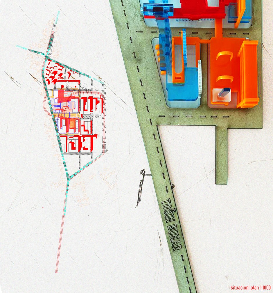 Fokus projekta je stvaranje novog kulturnog identiteta na zadatoj lokaciji, kroz sklop, oblikovanje i inovativne vidove transporta. Sklop je uređen po ortogonalnom rasteru, sa idejom projektovanja gusto izgrađenog i urbanog, ali jasnog prostora. Oblikovanje je u duhu hi-tech i retrofuturističke arhitekture, da bi se slagalo sa inovativnim rešenjem saobraćajne infrastrukture. Vođeni konceptom inverzije, podižemo pešački saobraćaj na P+1(u vidu staza) i nivo prvog sprata proglašavamo javnim (u koje uvodimo prostore za okupljanje i rekreaciju). Time, akcenat je stavljen na vertikalno zoniranje privatnih i javnih prostora. Početak i kraj konceptualizacije se ogleda u novoj tramvajskoj liniji koja pored praktične, ima i turističku vrednost (pr. Detroit People Mover). Prateći ‘inverziju’, tramvaj je zakačen za gornju šinu, spaja prostore prvog sprata i time postaje ključni element i pokretačka snaga života na lokaciji.