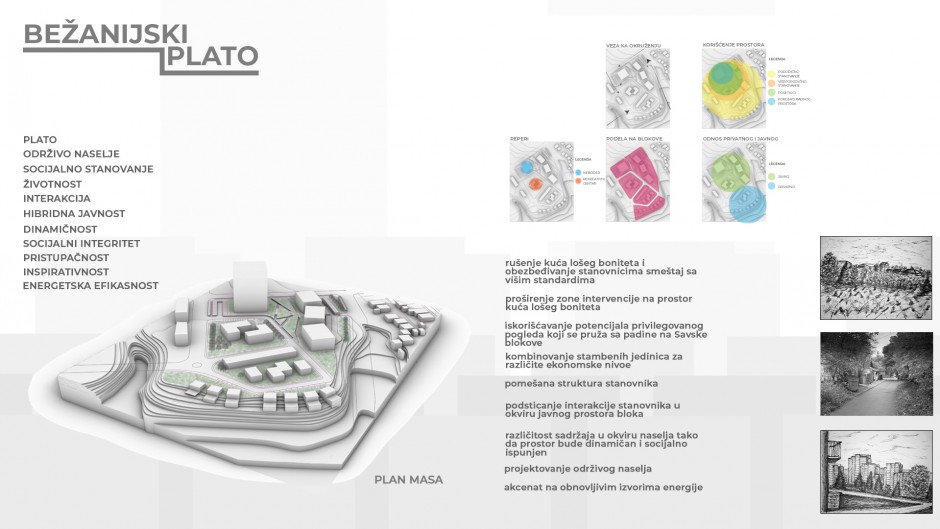 Projekat “Bežanijski plato” polazi od ideje platoa kao mesta sa kog se otvara novi vidik sa Bežanijske Kose na Beograd. Potencijal reljefa omogućava atraktivan pogled na Savske blokove i panoramu Beograda, pa predstavlja značajnu vrednost ovog bloka. U okviru bloka nalazile bi se stambene jedinice za porodice različite ekonomske moći, a uvođenjem različitih popratnih sadržaja podsticali bi se dobrosusedski odnosi. Otvoreni prostor između stambenih jedinica odlikuje velika pokrivenost zelenim površinama, koje doprinose kvalitetu urbanističkog rešenja naselja. U okviru naselja nalaze se porodične kuće, stambene zgrade, poslovni neboder, vrtić, dok njegov sadašnji prostor zauzima velika parkovska zona ostavljena isključivo pešacima i prilagođena ljudima svih starosnih dobi i interesovanja.
