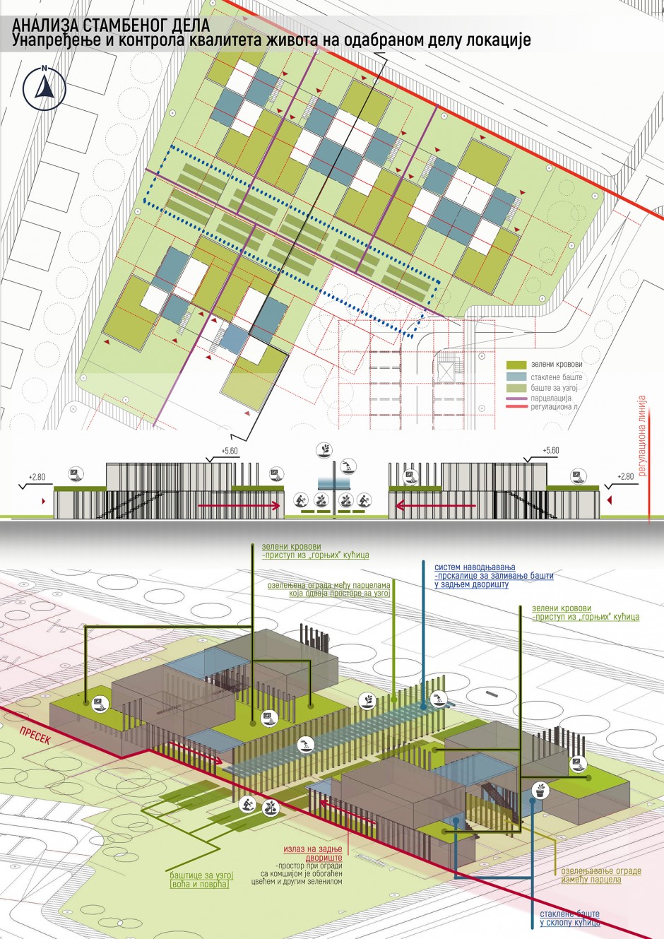 Ideja projekta je bila da se na zadatom delu lokacije u okviru postojećih sadržaja prostor unapredi i obogati dodatnim atraktivnim sadržajima uz poštovanje principa održivog razvoja. Cilj je bio smestiti stanovanje u delu bloka gde je ono već bilo zastupljeno. Pored toga oživeti prostor nekim javnim sadržajem. Kao najbolje rešenje predložena je biblioteka na otvorenom koja je izuzetan primer prostora za okupljanje mladih, druženja i obrazovanja (obzirom da se u susedstvu nalazi srednja škola). Što se tiče drugog dela lokacije – ideja je bila da se maksimalno aktivira i ostvari komunikacija među najprometnijim ulicama koje iviče lokaciju – Tošin bunar i Ulica 22. oktobra. Kao najracionalnije rešenje predstavljena je nadstrešnica. Zbog svoje dvojake uloge, jer omogućuje prolaz ispod nje gde su koncentrisani sadržaji poput restorana, kafića, kao i uslužni objekti poput poslastičarnica, suvenirnice, palačinkarnica i slično, čija je forma i kompozicija bila uslovljena postojećim garažama koje su bile u izuzetno lošem stanju. Pored toga, nadstrešnica je omogućila i prolaz preko nje ukoliko želimo zaobići sva pomenuta dešavanja i samo je iskoristiti kao komunikaciju među pomenutim ulicama