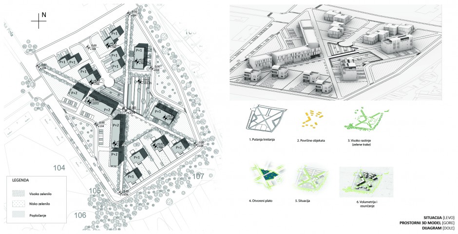 Projektovano naselje na Bežanijskoj kosi smo podelili na četiri podceline koje zajedno sa dijagonalnim stazama i zelenilom koje ih povezuje čine jedinstvenu celinu koja se sastoji iz tipova objekata koji pripadaju jednoporodičnom i višeporodičnom stanovanju sa različitim spratnostima (od P+1 do P+2). Celina je podeljena na parcele koje čine pipadajuće površine naših objekata, sa rešenim prilazima i parking mestima. Glavni motiv projekta je povezivanje zelenila već postojećih bežanijskih blokova sa novooformljenim stazama koje smo predvideli u projektu. Jedna celina pripada jednoporodičnom stanovanju i ima orijentaciju ka jugu, osim toga još je prisutan i tip višeporodičnog stanovanja sa komercijalnim prostorima u prizemlju i princip dvojnih kuća sa teretanom i pratećim sadržajima. Vodeći računa o insolacji, udarima vetrova i fizičkoj strukturi postojećih objekta projektovali smo naselje koje odgovara potrebama stanovništva i savremene arhitekture.