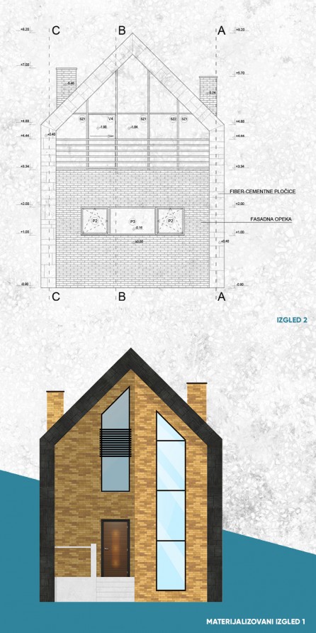 By Архитектонски факултет_Уредник on 29/07/2020СИНТЕЗА ЕЛЕМЕНАТА И СКЛОПОВА: ПРОЈЕКАТ ЗИДАНЕ ЗГРАДЕ Наставник: Невена Лукић, асистент Студент: Ивона Бојовић Опис пројекта: Разрађен пројекат двоспратне куће са подрумом који се користи. Карактеристичност ове куће јесте скривеност косина, односно све фасаде су геометријски правилне са правим угловима. Садржи два трема која се налазе на различитим странама куће и представљају главни и споредни улаз где оба воде до главне просторије у кући, дневне собе. На спрату се налазе спаваћа и радна соба где спаваћа има излаз на терасу. Што се тиче изгледа самих фасада, карактеришу их бројни прозори који омогучавају продор природне светлости у унутрашње просторије. Обрада фасада је дата у виду малтера на рабицу и фасадне опеке.
