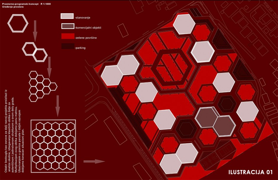 Одабир шестоугла као основе за даљи развој пројекта произилази из анализе околине, избегавања класичних облика и жеље за јединственом и аутентичном структуром у овом делу града. Мултипликацијом овог облика добијамо јасну матрицу убацивањем у границе парцеле и даљим развојем добијамо коначан ситуациони план.