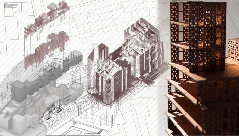Prva ideja o monolitnoj formi javila se usled zaključka da stanovi koji izlaze na front prometne i samim tim bučne ulice, moraju biti odvojeni od nje ,,čvrstom“ i ,,teškom“ pregradom. Međutim, uočavanjem razlika u budućim ambijentima unutar i van bloka (relativni mir naspram prometnog fronta), javila se potreba za adekvatnijom ,,lakšom“ strukturom; koja se postepeno širi u bloku prateći njegovu geometriju.