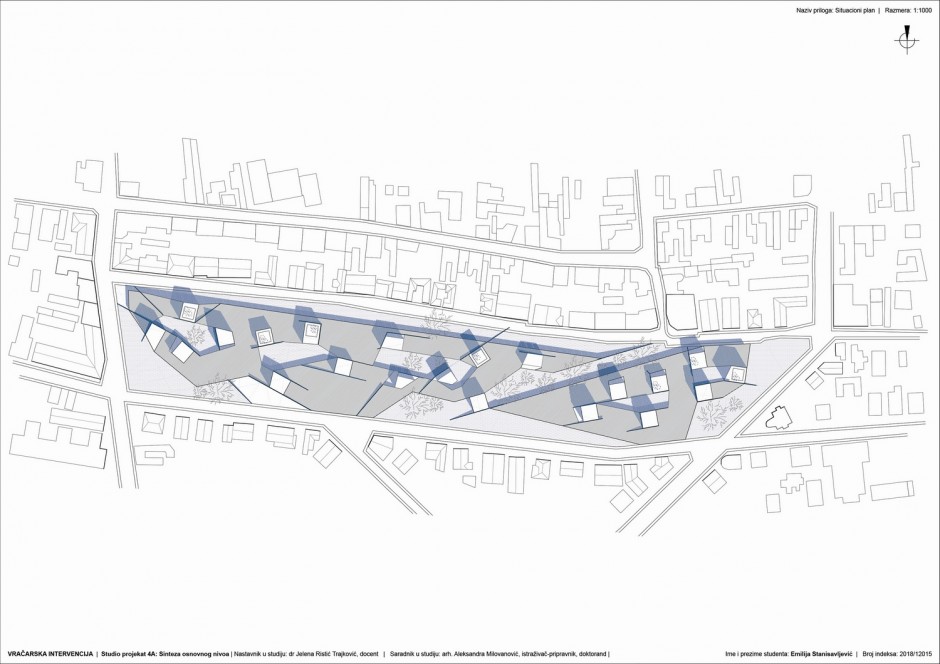 Vračarska intervencija izvedena je u bloku gusto naseljenog dela grada, stvaranjem potpuno novog okruženja, drugačijeg od okoline. Celinu čine javni prostor u parteru namenjen svima, polu-javni prostor ploče dostupan stanovnicima i privatni stambeni prostor – urbane vile. Geometrija ploče, atrijuma i objekata, kao i organizacija prostora u parteru, posledica su direktnog odgovora na postojeće okruženje i ostvareno kretanje na Vračaru.
