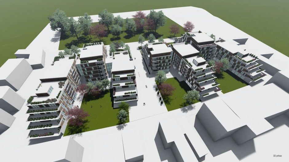 У склопу блока су формиране двије групације које се састоје из седам благо закошених линеарних трактова. Концепт је заснован на вези стамбеног простора са екстеријером, на начин да се преко каскадних озелењених балконских површина објекат спусти према постојећем парку који се налази у непосредној близини. Овако се амбијентално повезују парк и стамбени блок и омогућује се посматрачима са обе стране угодан и уравнотежен амбијент.