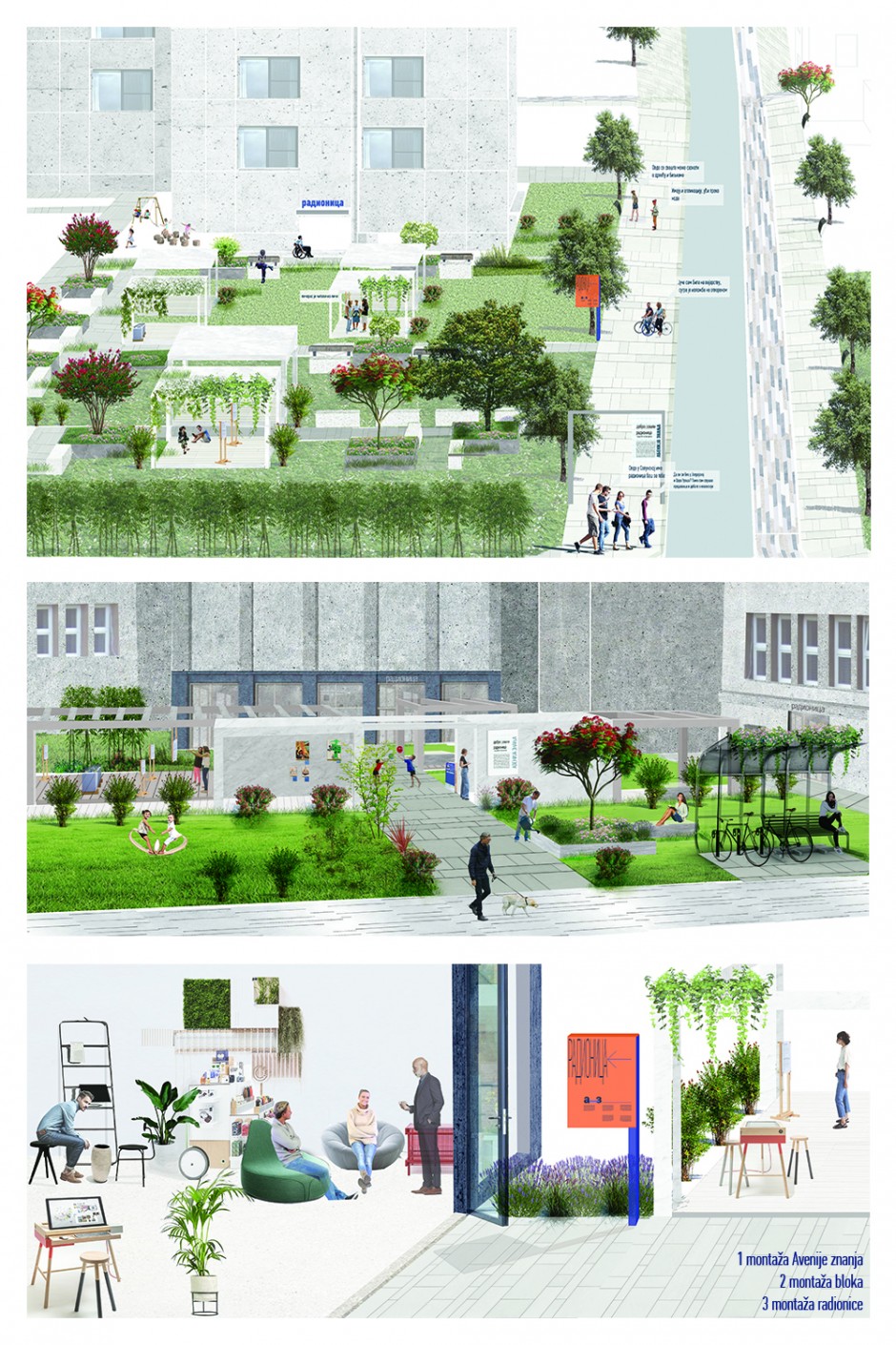 Концепт нашег пројекта се заснива пре свега на неколико социолошких проблема друштва као што је друштвена апатија, отуђеност, недостатак духа колектива и рада у заједници. Након идентификовања таквих њима сличних проблема предложили смо решење у виду отварања радионица које би се налазиле у напуштеним или недовољно активним приземљима зграда на локацији. У радионицама би се одвијао различит садржај намењен свим заинтересоваим становницима који желе да се друже, да учествују и да уче у интеракцији са другим. Важно је напоменути да би се те радионице углавном налазиле непосредно уз улицу и на тај начин са више њих у низу формирале авенију знања. Поред садржаја у самим радионицама, сав пратећи садржај и мобилијар који се налази у авенијама знања био би подређен идеји града који учи тј. био би у служби радионица и потпомагао би њихов рад и развој.