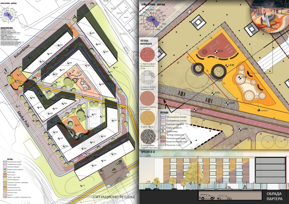 Основни мотиви пројекта се базирају на томе да испуне потенцијале природног положаја локације и визуре. То постижемо слободним приземљем објеката, каскадирањем, снижавањем висина објеката од почетка локације до падине. У ту