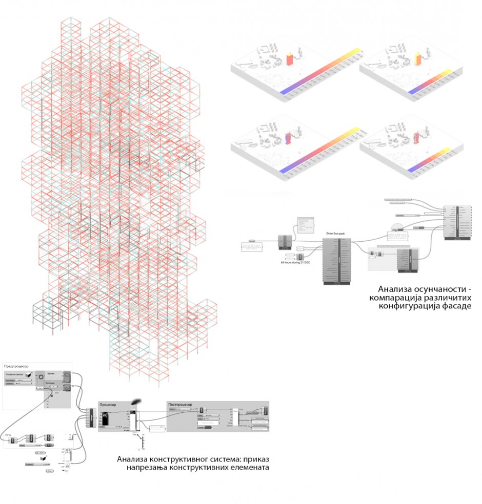 Пројекат ЕКО_ХАБ указује на актуелне еколошке проблеме и нуди концепт архитектуре која подржава одговоран однос према животној средини. У склопу овог истраживања кроз пројекат, еколошки аспекти били су укључени у разматрања три аспекта архитектуре високог објекта: (1) волуметрију, (2) програм, (3) конструктивни систем и материјализацију. Форма објекта резултат је form-finding процеса у коме су комбиноване bottom-up рачунарске генеративне процедуре са top-down стратегијама моделовања заснованим на увођењу екстерних ограничења локације (Блок 17 на Новом Београду), укључујући утицаје инсолације, ветра, визура. У програмском смислу овај објекат мешовите функције намењен је животу и раду заједнице експерата различитих профила који су у свом раду орјентисани на проблеме животне средине. Архитектонски простор осмишљена је да подржи умрежавање, сарадњу и тимски рад, као и да буде флексибилан како би се прилагодио различитим организационим захтевима. Предложени конструктивни систем је рационална, а кроз нумеричке анализе структуралних перформанси смањен је утрошак материјала. За изградњу и опремање објекта предвиђени су еколошки материјали са ниском емисијом СО2. Аспекти одрживости укључени су и кроз предлог технологије изградње и план за формирања банке материјала као вид ефикасног размишљања о животном циклусу објекта.
