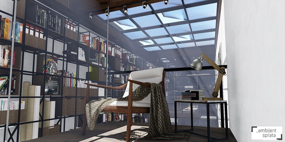 Glavni motiv u samom projektu rekonstrukcije kuce predstavlja uvodjenje biblioteke koja se prostire duz celog zida i kroz obe etaze u objektu. Na ovaj nacin je kako formalno tako i funkcionalno uoblicena i predstavljena tema idealnog radnog prostora, koja doprinosi i vizuelnom dozivljaju celokupnog enterijera.