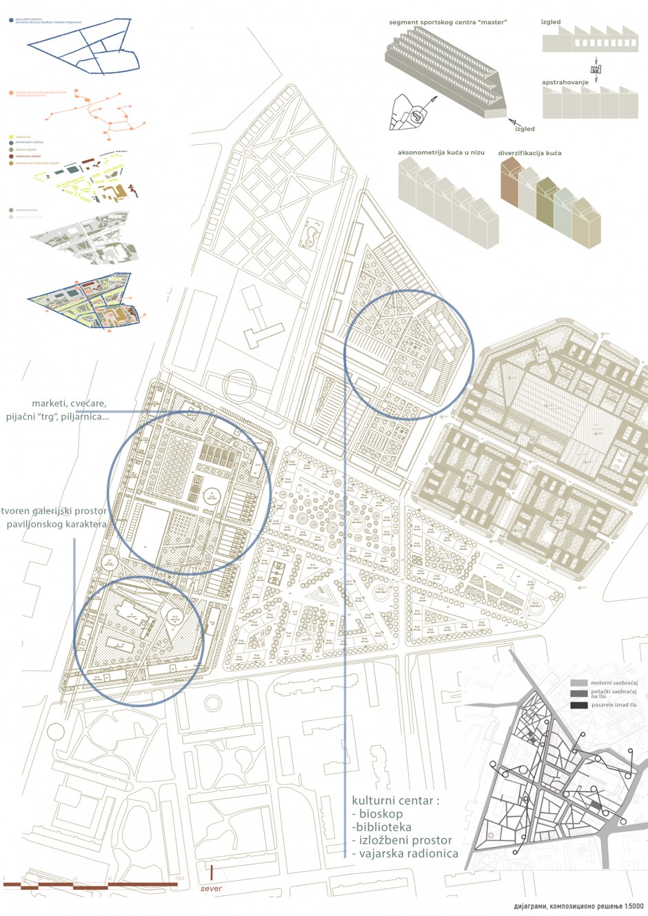 Приликом разраде овог урбанистичког решења, бавила сам се мањим подцелинама унутар блока, као и њиховим међусобним прожимањем, тачније како заправо спојити вишепородично и једнопородично становање, затим велики комерцијални објекат попут Лидла са једним од главним мотива у овом блоку – урбаним воћњацима и баштама на једној страни, као и културним изложбеним садржајем на другој. Разлику у карактеру самих садржаја покушала сам да премостим линијским парком изнад којег пролази пасарела, која се завршава, тј. спаја са баштенским простором на северу блока. Пасареле саме по себи, као и објекти над којима се протежу, чине целину, а са мотивима попут косих забата на крововима кућа који асоцирају на “shat” хале, па и масивних застакљених вишепородичних објеката, требало би да на локацији оживе и допринесу “озелењеном” индустријском амбијенту.