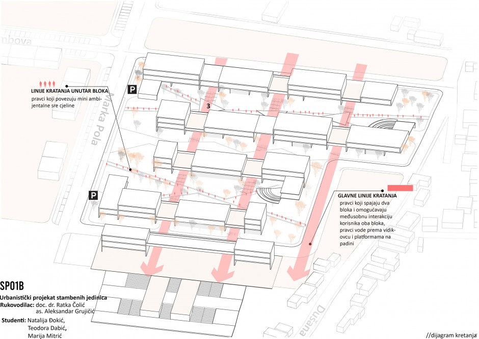 Urbanističko rešenje se sastoji od dva poluotvorena bloka, ova dva bloka povezuju tri pravca kretanja koja vode ka zelenom vidikovcu koji pruža pogled ka Novom Beogradu.