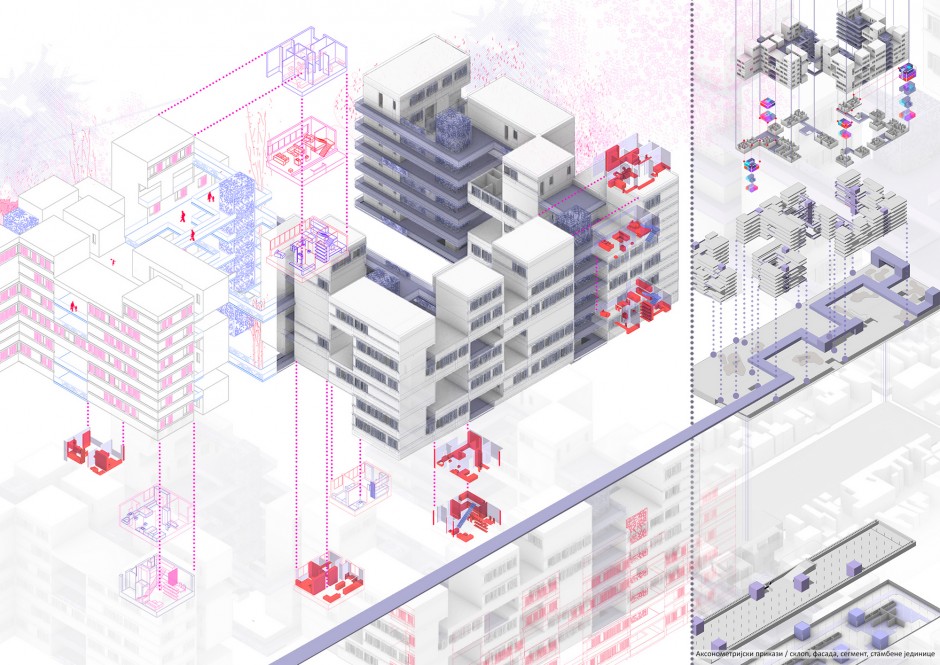 Какофонија простора – комуникација као одговор. Комуникација преведена у буквалном смислу у архитектонски контекст као примарну асоцијацију поставља традиционалне елементе – степениште и коридоре. Ако би такав простор престао да буде само утилитаран, примио друге функције, перцепција би се окренула. Када би комуникације постале циљ кретања, не искључиво средство, створили би се нови услови у којима би архитектура градила саму себе, јер би и постојала због себе. Конкретно – кокетрирање вертикалних и хоризонталних комуникација би отелотворило динамику простора
