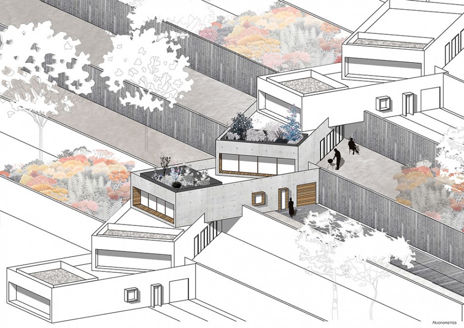 Težište koncepta predstavlja akcentovanje zelenih ambijenata u izgrađenom prostoru. Na nivou stambene jedinice, prožimanje zelenila i unutrašnjeg prostora se ostvaruje na nivou dvorišta u prizemlju objekta gde je smeštena noćna zona, dok se na spratu – u dnevnoj zoni ambijent prirode javlja u vidu ozelenjene krovne terase. Tipologija objekata i artikulacija terena omogućili su postizanje jednakovredne raspodela zelenih površina po svakoj stambenoj jedinici.