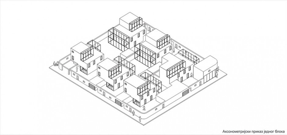 Пројекат предлаже четири блока породичног становања и два комерцијална блока који имају улогу у заштити од негативних утицаја, као и улогу у активацији локалног становништва.