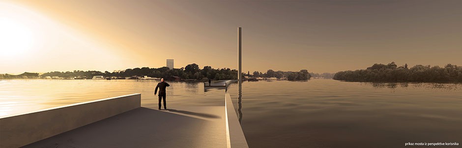Istraživanje veze leve i desne obale Save, veza Beograd – Novi Beograd, je otvoreno posmatranjem siluete dunavskog korita, dominantnog toka, i obala koje on tangira. Spajanje dunavskog keja i Donjeg Grada sa parkom Ušće i zemunskim kejom u daljini, u jednu kontinualnu prostornu celinu je rešeno formiranjem pešačkog mosta koji bi ujedno bio i prvi tog tipa u Beogradu. Sastavljen jo od dva dela koji plutaju i klize po kružnici prečnika 2 kilometra a dodiruju se i rastavljaju na sredini reke. Kutijaste je strukture tako da je zatvoreni korisni prostor utopljen u vodu.