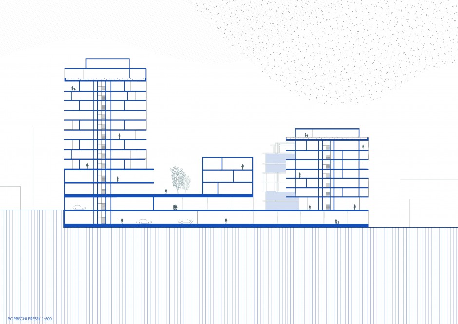 Podium sa slobodnostojećim objektima kao urbana forma, savladava teren u padu koristeći kaskadne platoe na kojima su postavljeni stambeni objekti tako da im spratnost opada niz južnu padinu. U kaskadama podiuma su smešteni komercijalni i rekreativni sadržaji kao programski dodatak stambenom kompleksu. Sklop samih objekata karakteriše jedno jezgro koje servisira duboku osnovu sa čiji je veliki deo namenjen terasama i lođama kao polivalentnim otvorenim prostorima. Oblikovanje karakterišu umrežavanje ploča i fasadnih šajbni koje postaju prostorne spirale koje međusobnim prožimanjem generišu konačnu formu.