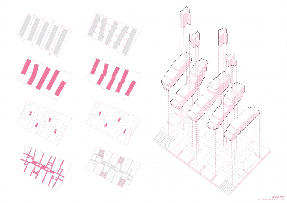 Na predmetnom bloku predložena je grupna forma koja umrežava šest jednotrakta orjektacije sever-jug zajedničkim vertikalnim jezgrima strateški postavljenim između njih. Na ovaj način se dobija dinamična mreža javnih prostora od kojih su manji – javniji pristupni platoi, dok su veći i duži namenjeni kao zeleni polujavni i privatni prostori bašti za stanare u prizemlju.