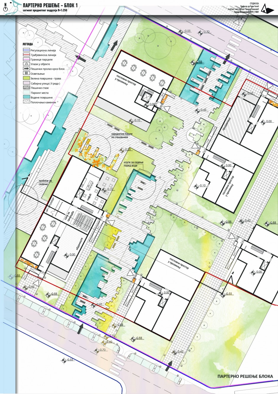 Projekat nastoji da ispuni što više savremenih zahteva održivosti u planiranju novih naselja, i da kao takav postane primer načina korišćenja resursa i energije. Ovo je postignuto planiranjem upravljanja kišnicom – vodom, primenom plavo-zelenih krovova i same vode kao elementa urbanog dizajna, kao i racionalnim korišćenjem zemljišta u korist zelenim površinama, ali i postizanja ekonomičnog stanovanja u projektovanom bloku. Novoprojektovani blok nastao bi na mestu gde trenutno postoji gusta i neplanska gradnja, koja ne nudi izuzetno dobre kvalitete za život i rad stanovnicima. Zamenom ove postojeće strukture korisnicima se nude funkcije stanovanja, rekreacije i rada u prijatnom i zdravom ambijentu.
