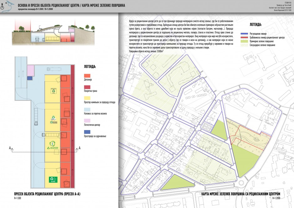 Tema projekta je stvaranje inovativnog i istovremeno zdravog reciklažnog centra, koji će se lako koristiti, okupljati ljude, obrazovati ih i omogućiti im prijatan ambijent za rad i odmor. Projekat se sastoji iz 3 dela: 1. Samo industrijsko  postorjenje reciklažnog centra koje je ukopano u zemlju; 2. Prostor za donošenje i odlaganje otpada za reciklažu; 3. Parka koji se nalazi na brdu iznad postrojenja, koji u sebi sadrži amfiteatar za predavanja i izvedbe, učionicu za radionice, vidikovac i prostor za ležanje. Park i sadržaj koji se nalaze na reciklažnom centru ga prate po izohipsama i tako stvaraju prijatan ambijent za šetnju, rad i odmor.