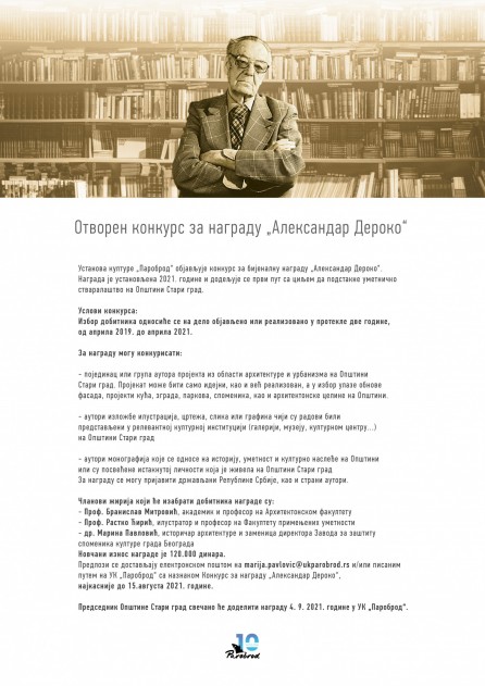 By Архитектонски факултет_Уредник on 15/04/2021Установа културе „Пароброд“ објављује конкурс за бијеналну награду „Александар Дероко“. Награда је установљена 2021. године и додељује се први пут са циљем да подстакне уметничко стваралаштво на Општини Стари град. -