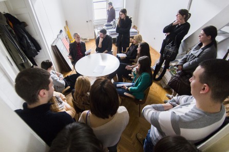 By Arhitektonski fakultet on 10/04/2014Događaj „Dva sata bez vrata“, nastao kao promocija Letnje škole arhitekture 2014, održan je 24.02.2014. godine na Arhitektonskom fakultetu u Beogradu. Ovom akcijom, Arhitektonski fakultet u Beogradu postao je muzej na 2 sata, a akciji je prisustvovalo više od 300 studenata i oko 120 zaposlenih na Arhitektonskom fakultetu u Beogradu. Akciji je prethodila prezentacija Letnje škole u amfiteatru fakulteta, gde se predstavio novoformirani organizacioni tim. -