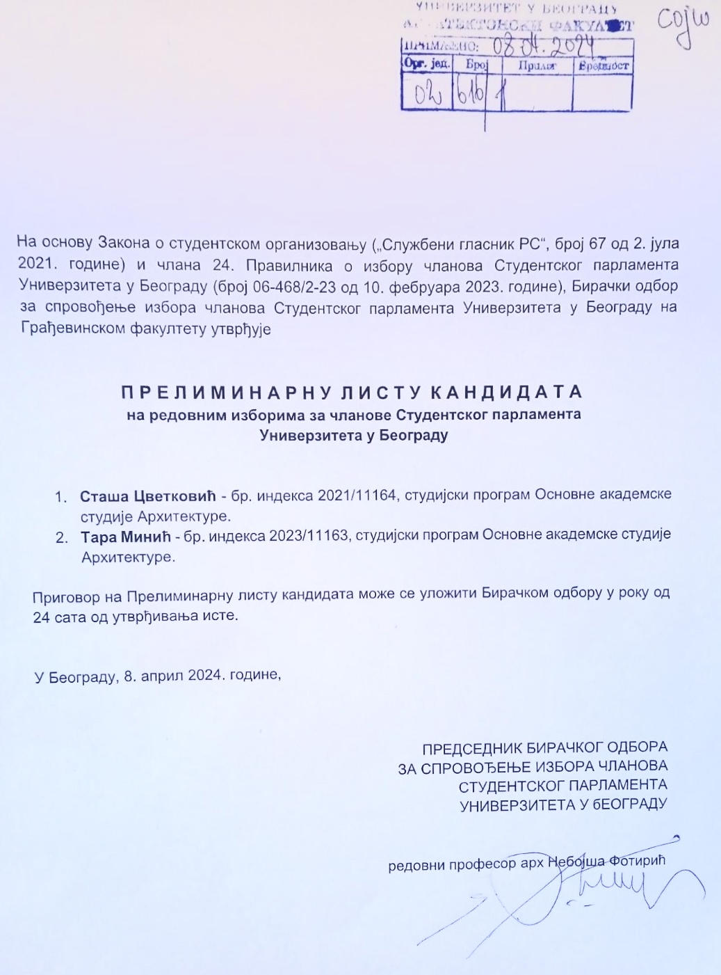 - Preliminarna lista kandidata na redovnim izborima za članove Studentskog parlamenta (8.04.2024.)